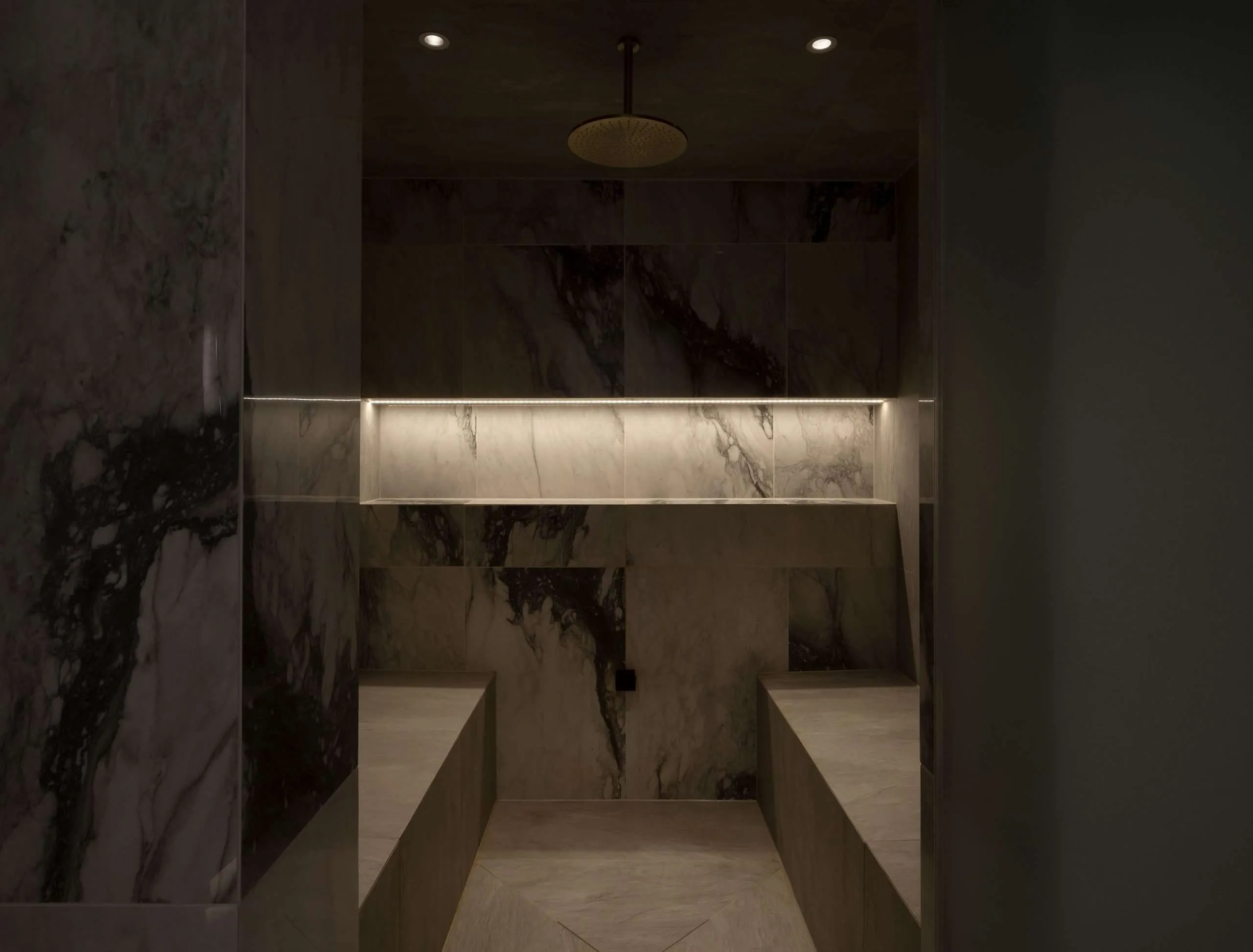 The floors and remaining walls were then lined in a softer more textured beola stone tile for a dramatic contrasting effect.