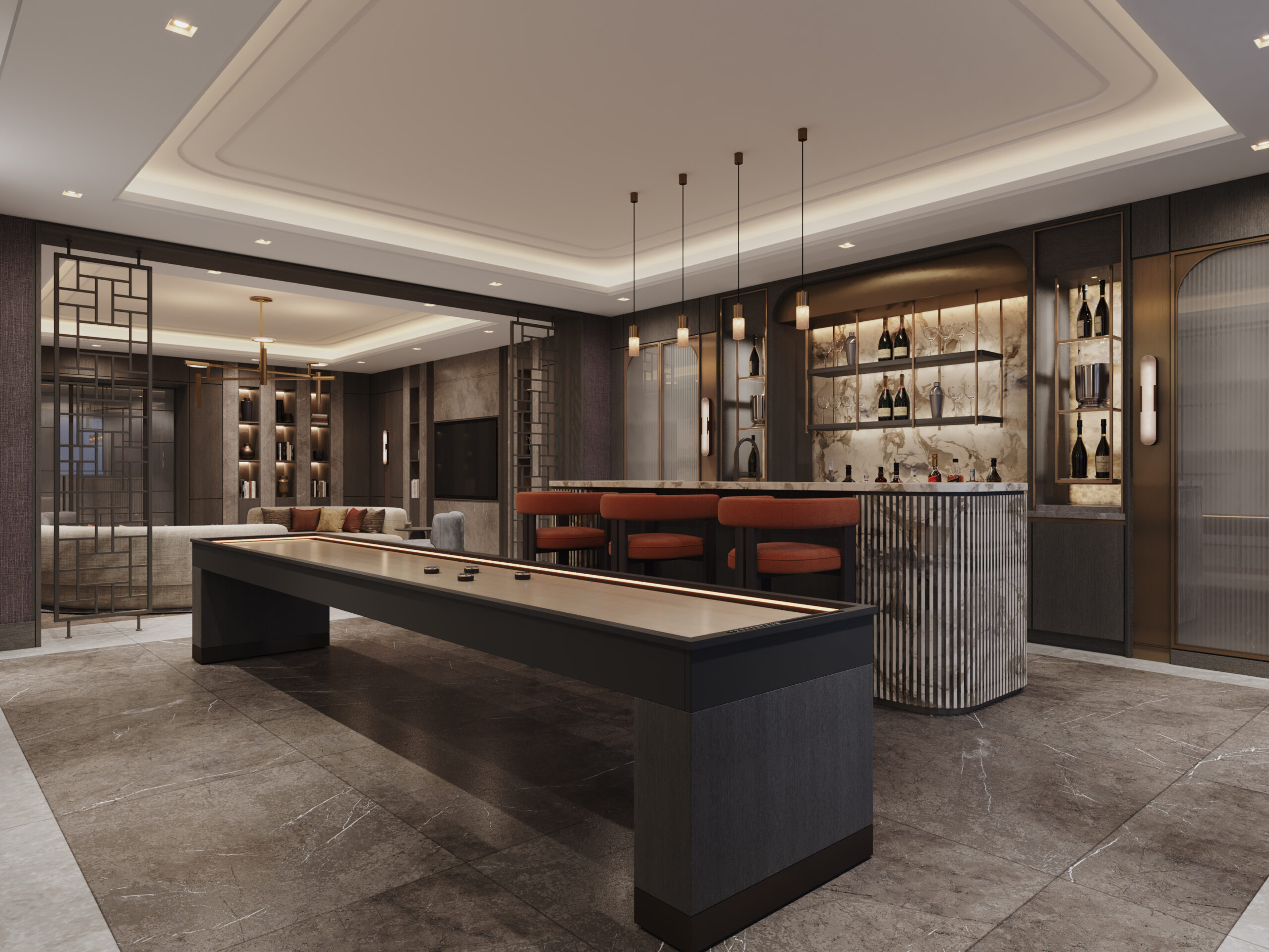 We consider the furniture in this space very carefully and incorporate bespoke cabinetry that can either be built around, conceal, or store the games you desire so they blend harmoniously and don’t look out of place in the room’s surroundings.
