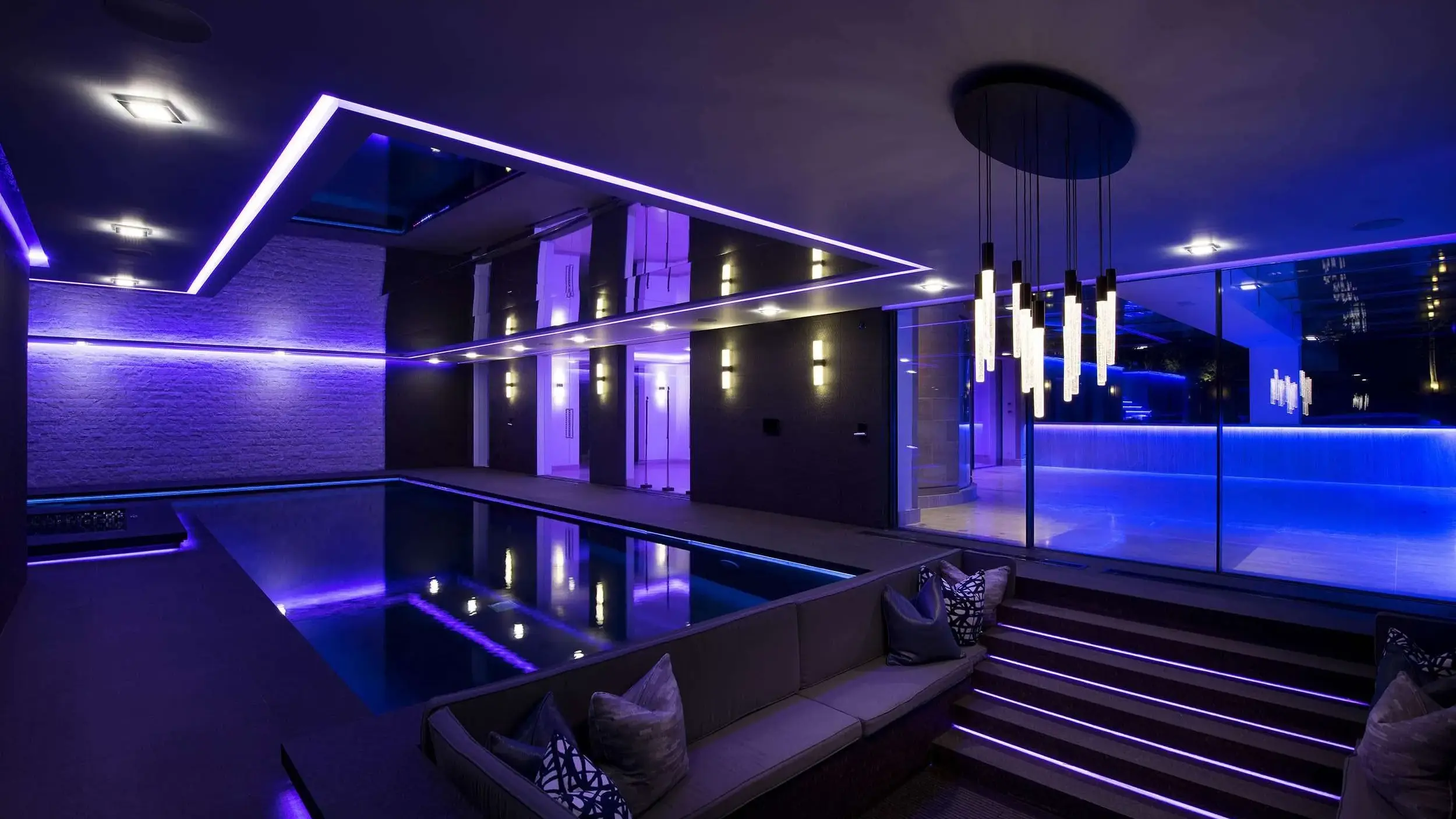 We also incorporated LED strips to the perimeter of the pool, around the edge of the ceiling and to the surround of the ceiling coffer which reflects beautifully on the water below. The addition of sunken seating to the side of the pool with low hanging pendant lighting and large bespoke durable cushions adds a touch of luxury to the space.