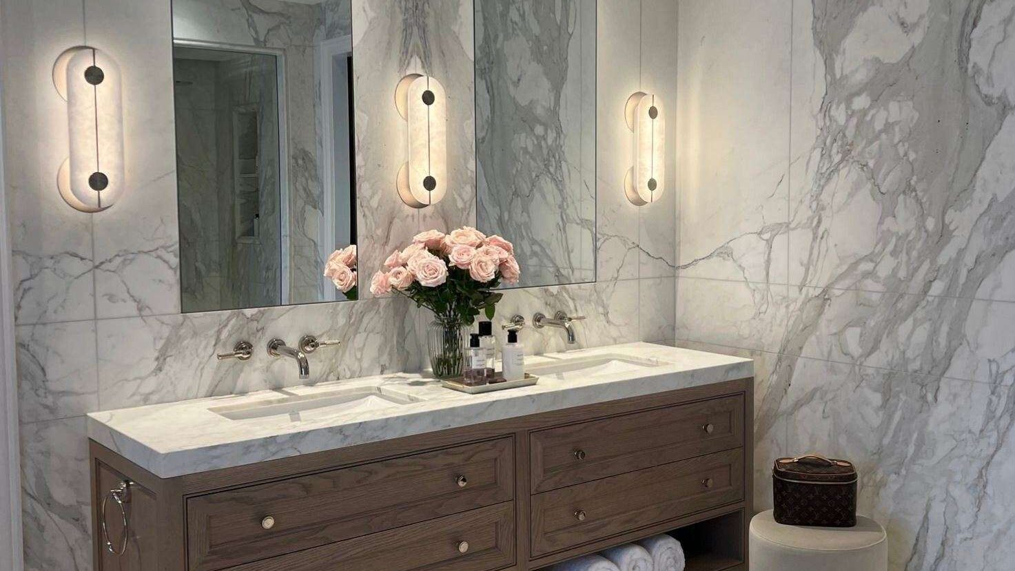 One rule to always follow with bathroom lighting is to never hang a bathroom fixture above the mirror. Instead, install lighting fixtures on either side of the mirror as they’ll light your face evenly and frame you in your most flattering light. Placing downlighting around the sides of the room, rather than in the middle, will also help avoid shadows.