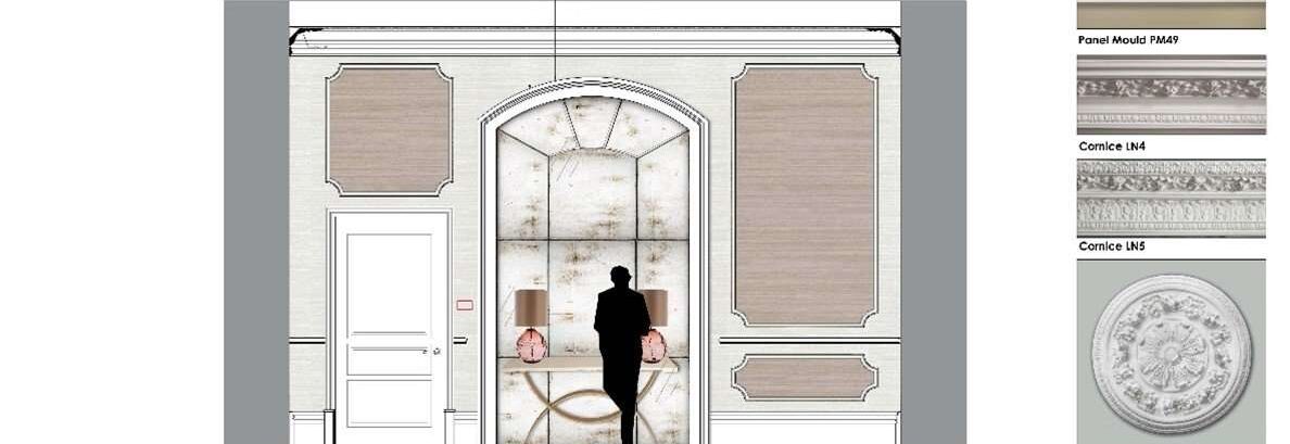 So when deciding on the style of cornicing, architraves and ceiling roses we knew we had to be mindful. We wanted them to flow from room to room, stay in keeping with the property, and complement the intricate detailing on the marble columns yet still remain contemporary.
