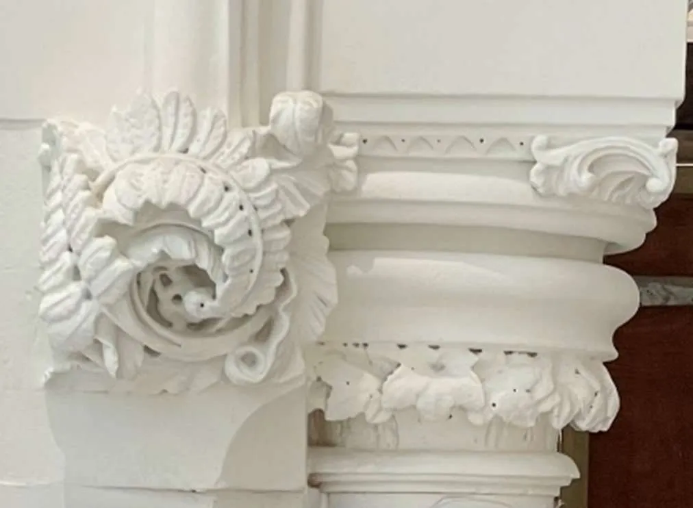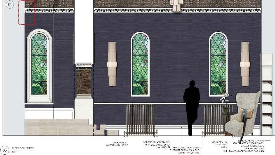 The stone archways are going to be restored and painted white with the two raised profiles in the arch being gilded in pale gold leaf. The existing decorative pieces around the columns are going to be restored to its original gothic design and painted white, whilst the marble shaft is going to be maintained and cleaned.”