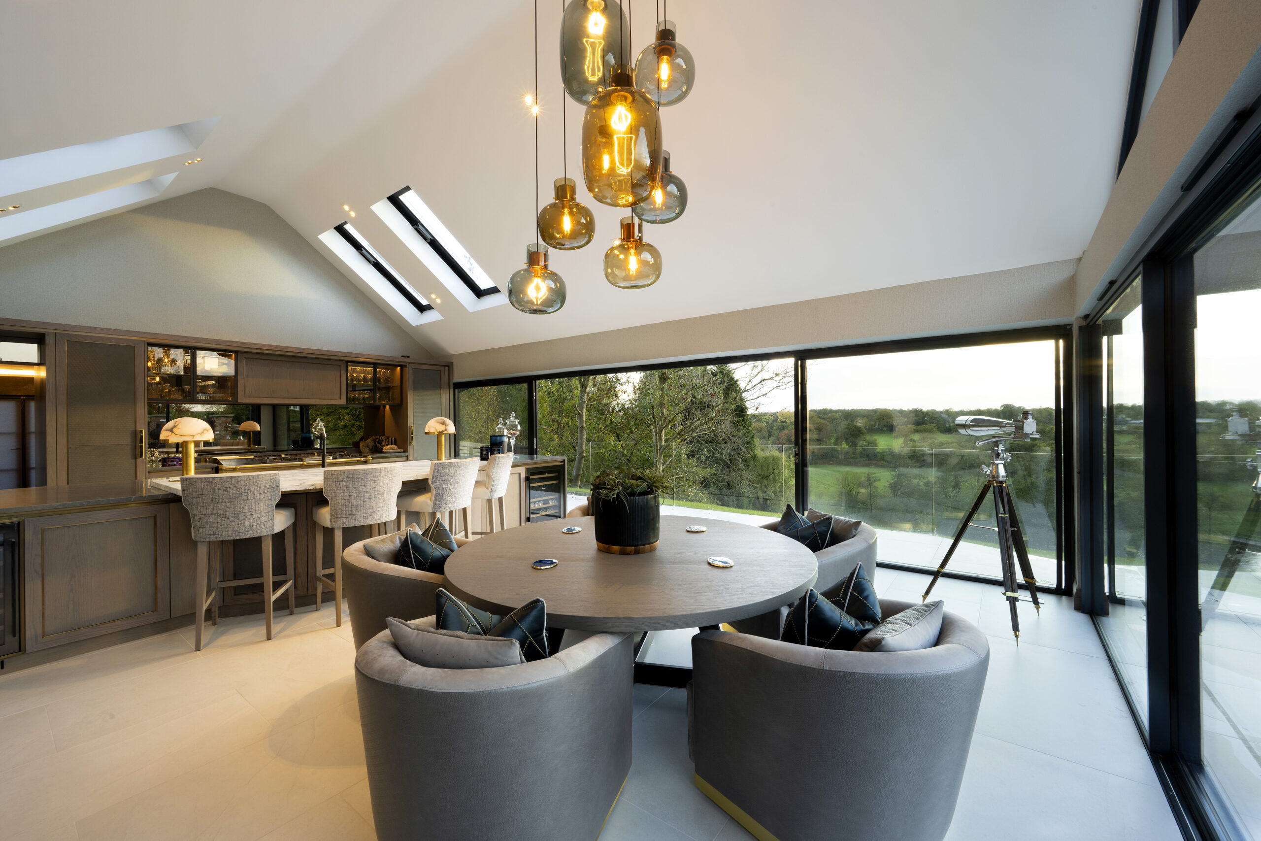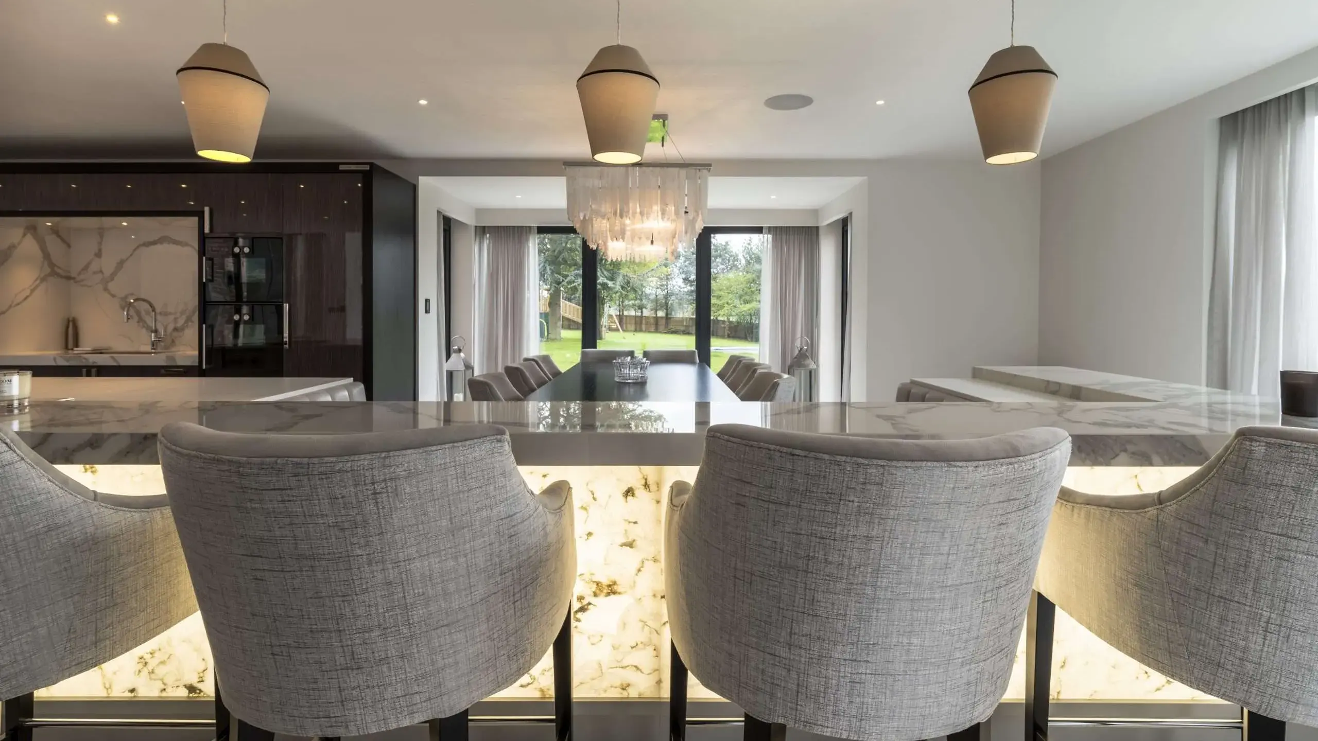 A kitchen wouldn’t be complete without impactful, striking lighting. Integrating large low hanging chandeliers and pendant lights over your kitchen island will bring plenty of light into the space, making it appear more spacious as well as adding a touch of opulence.