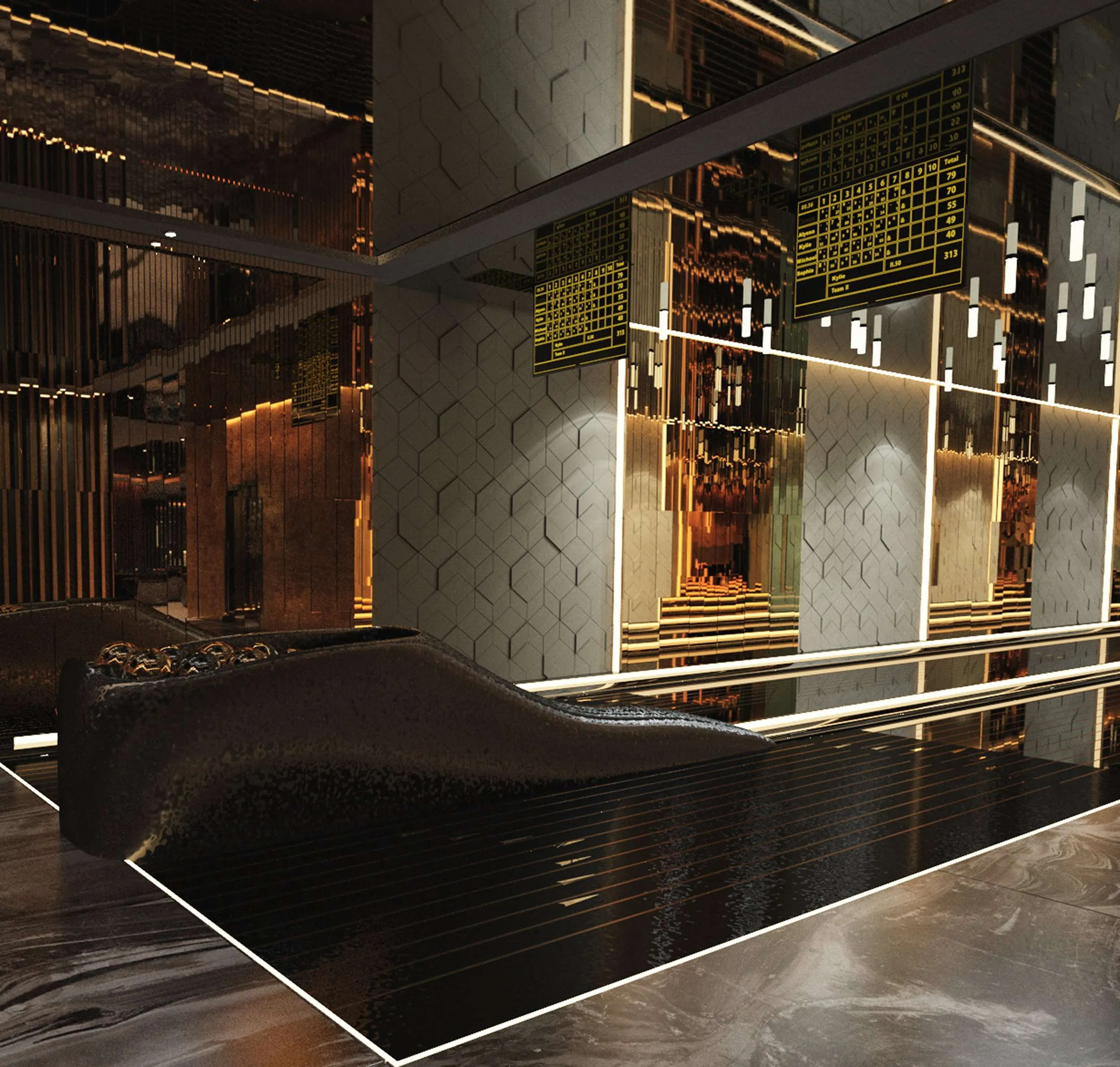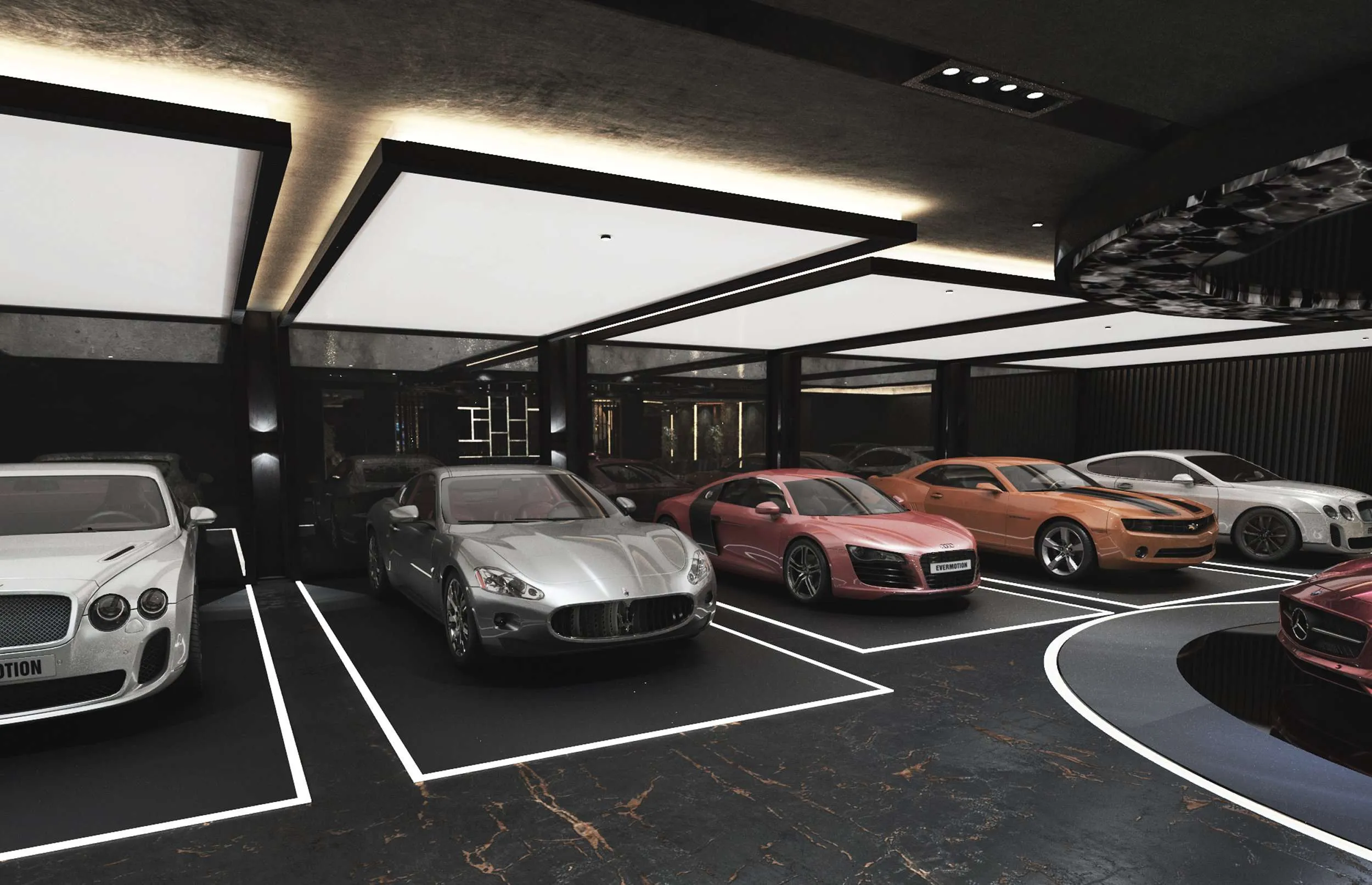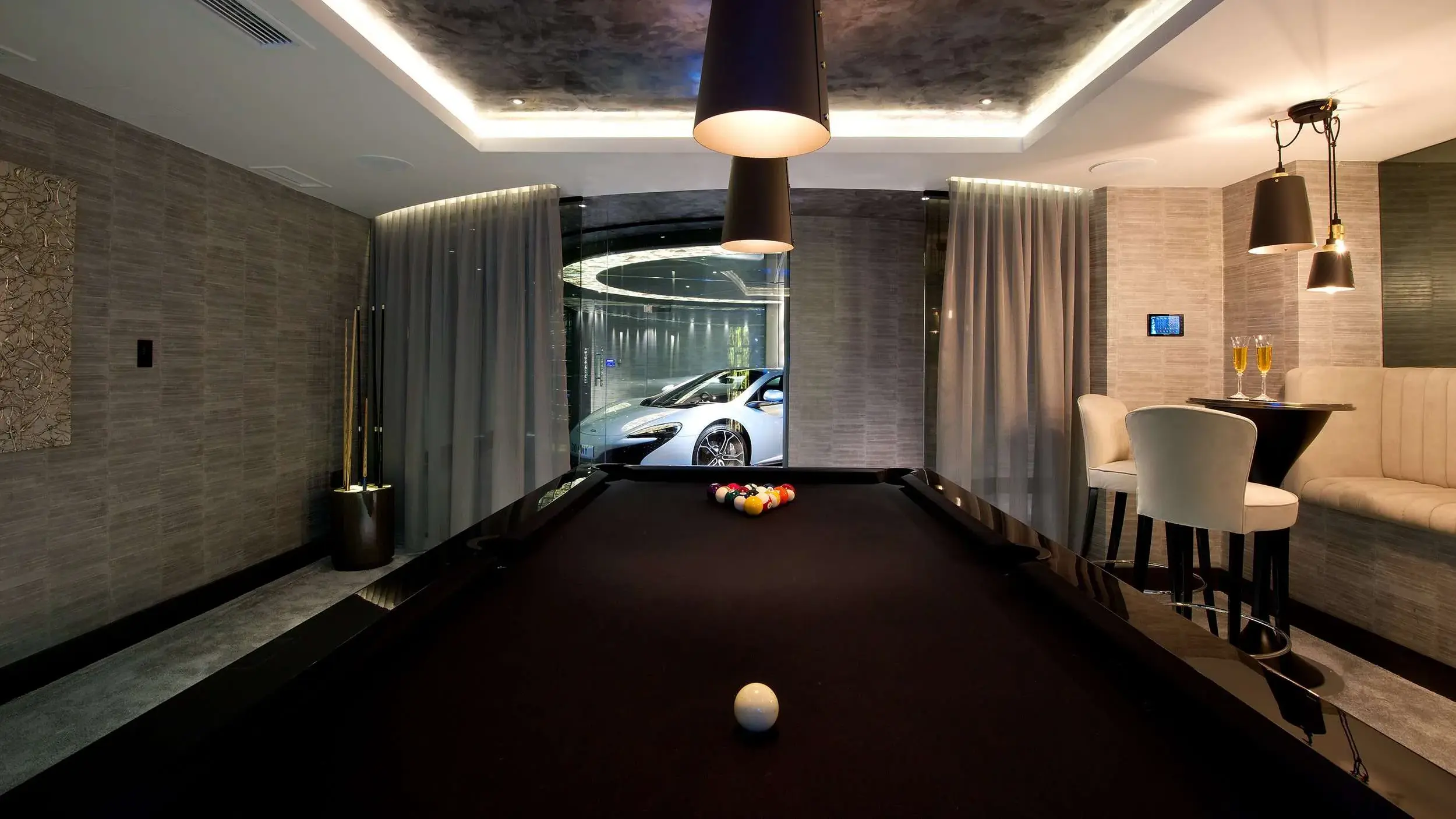 This space which once was a former garage now portrays a dark, sultry, and masculine design to house our client’s invaluable collection of sports cars. This man cave now embodies the essence of a moody underground club, doubling up as a sanctum of entertainment where the client can play pool in the glamour of a subterranean bar.