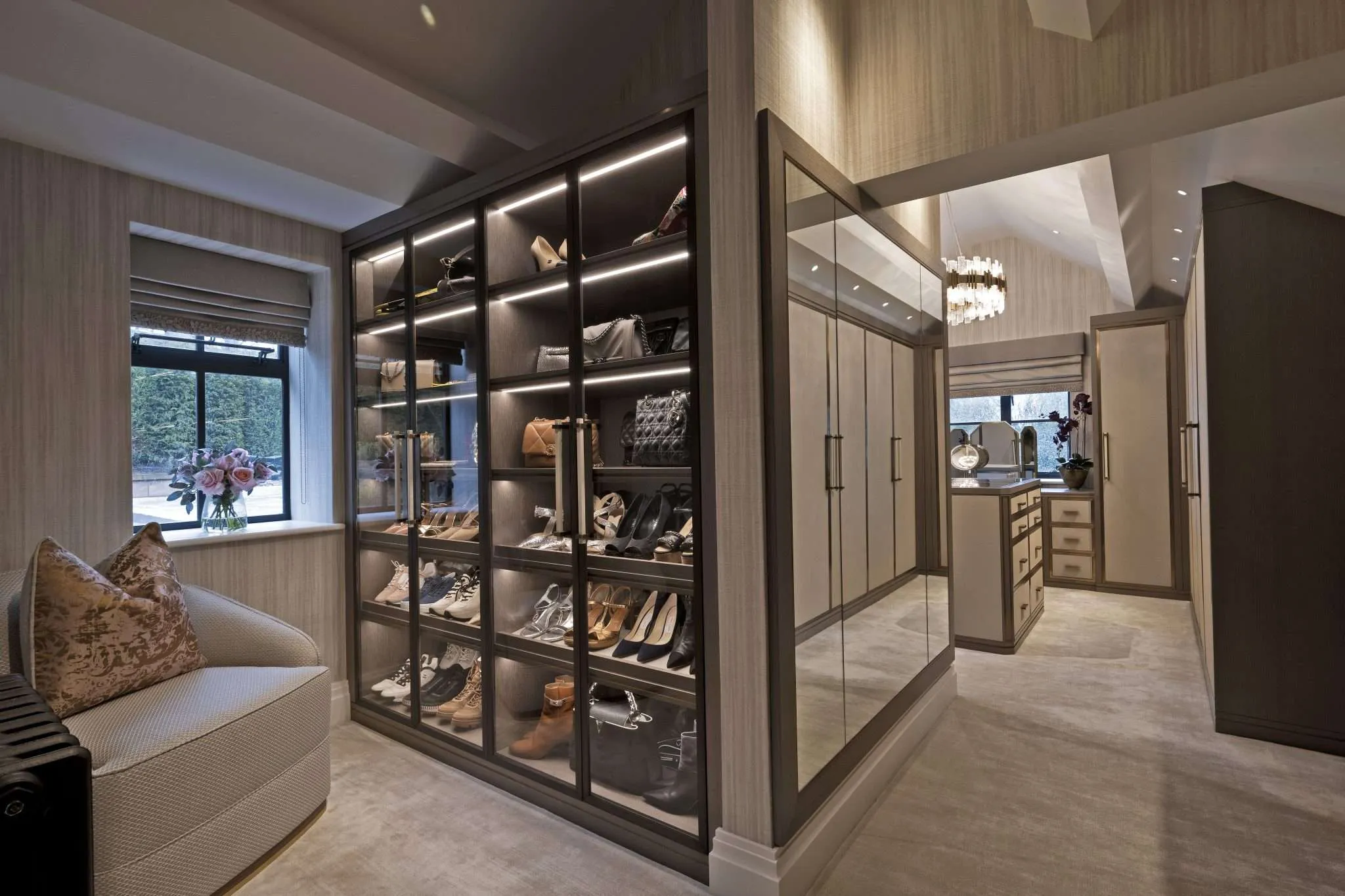 The cabinetry consists of two timbers. The front face is a light walnut and the inner carcass that lines each section are a beautiful dark oak. A stepped vertical pier detail with inset metal trim frames each section we also incorporated the same detail to the plinth.