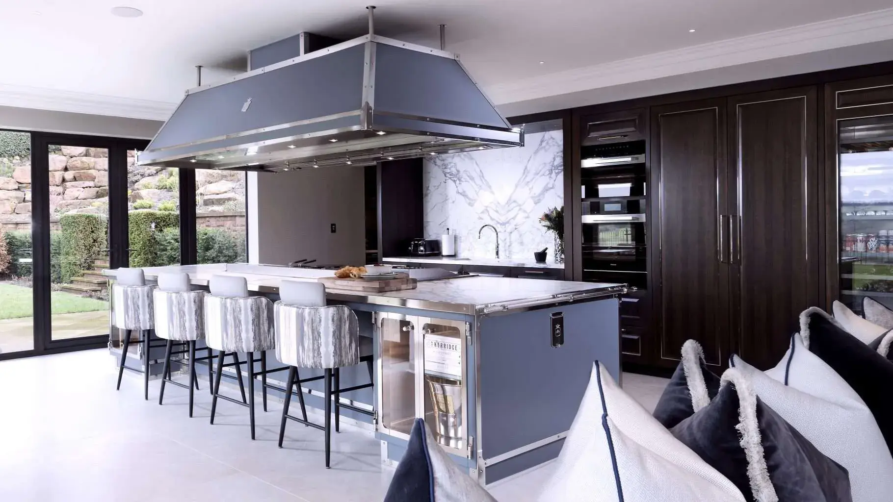 This space features the beautiful Officine Gullo oven range which is incorporated into stained oak cabinetry. We also implemented an oversized feature extractor canopy which hangs proudly above the large kitchen island, adding a wonderful focal point to the room.