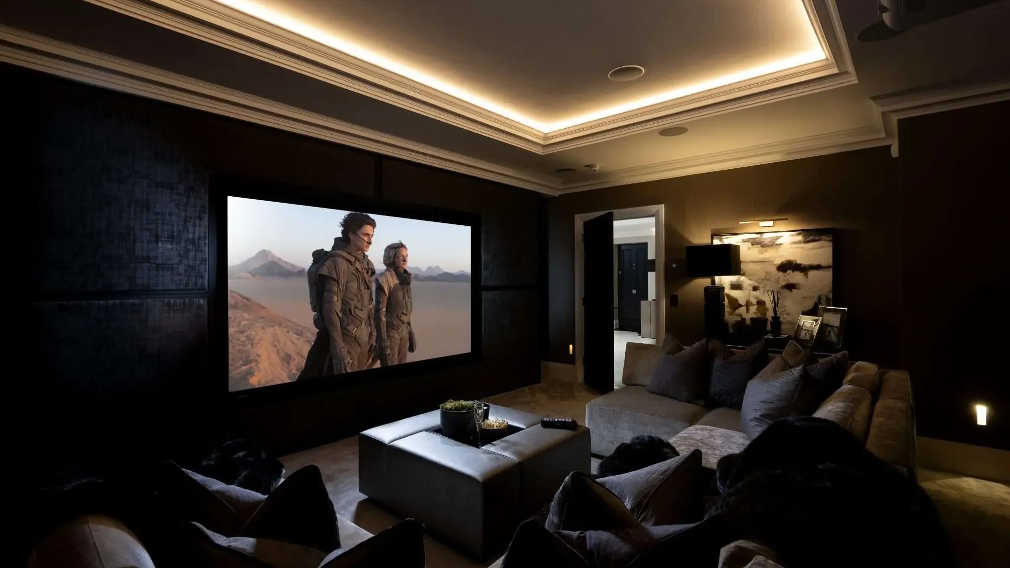 In addition to creating distinct zones, lit coffered ceilings add a layer of lighting that can be dimmed to achieve the perfect ambience by framing the space and adding to the ambiance.