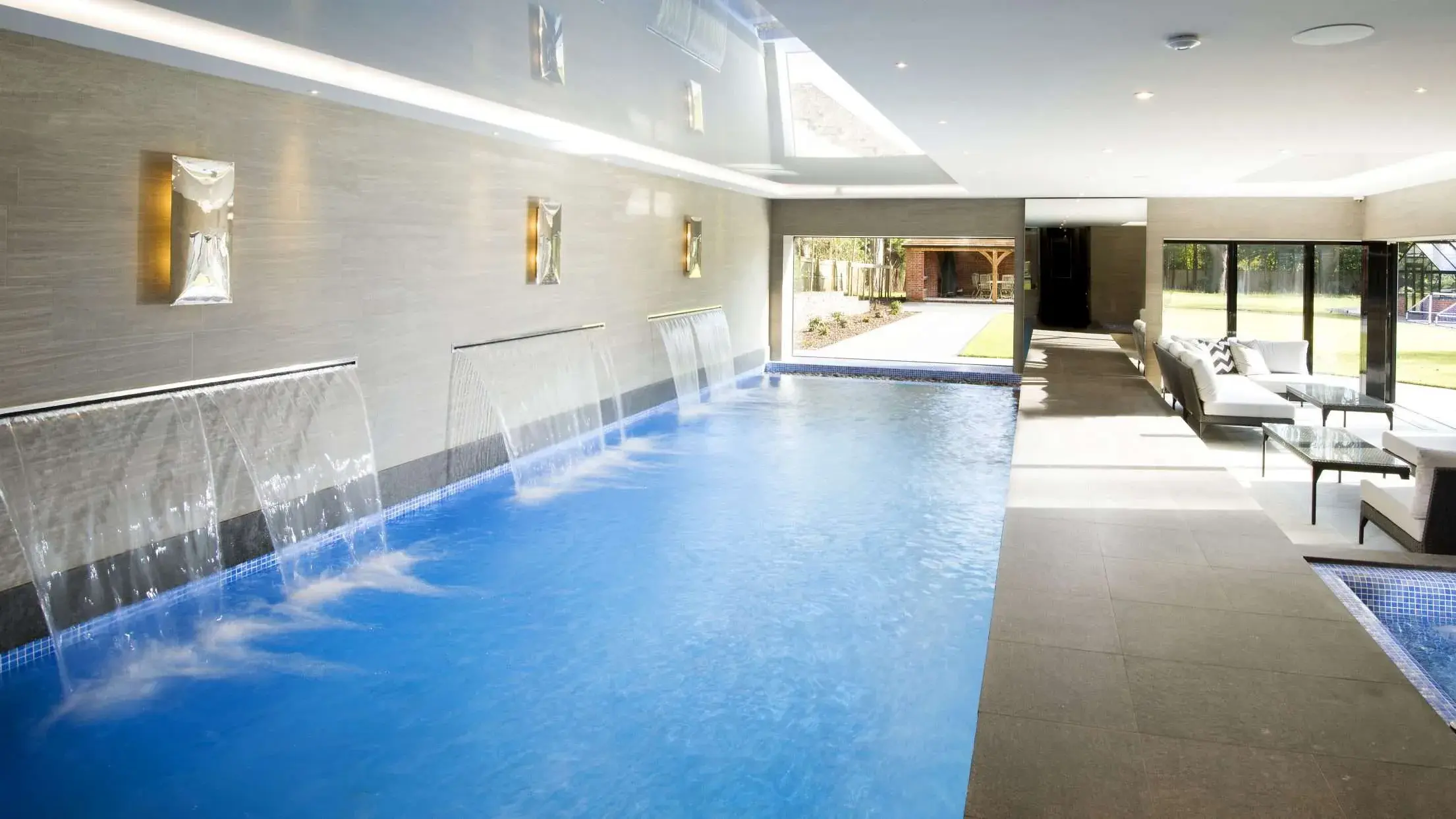 A seating area boasts glazed bifolding doors which open out to the garden, whilst the swimming pool itself offers an oasis of calm.