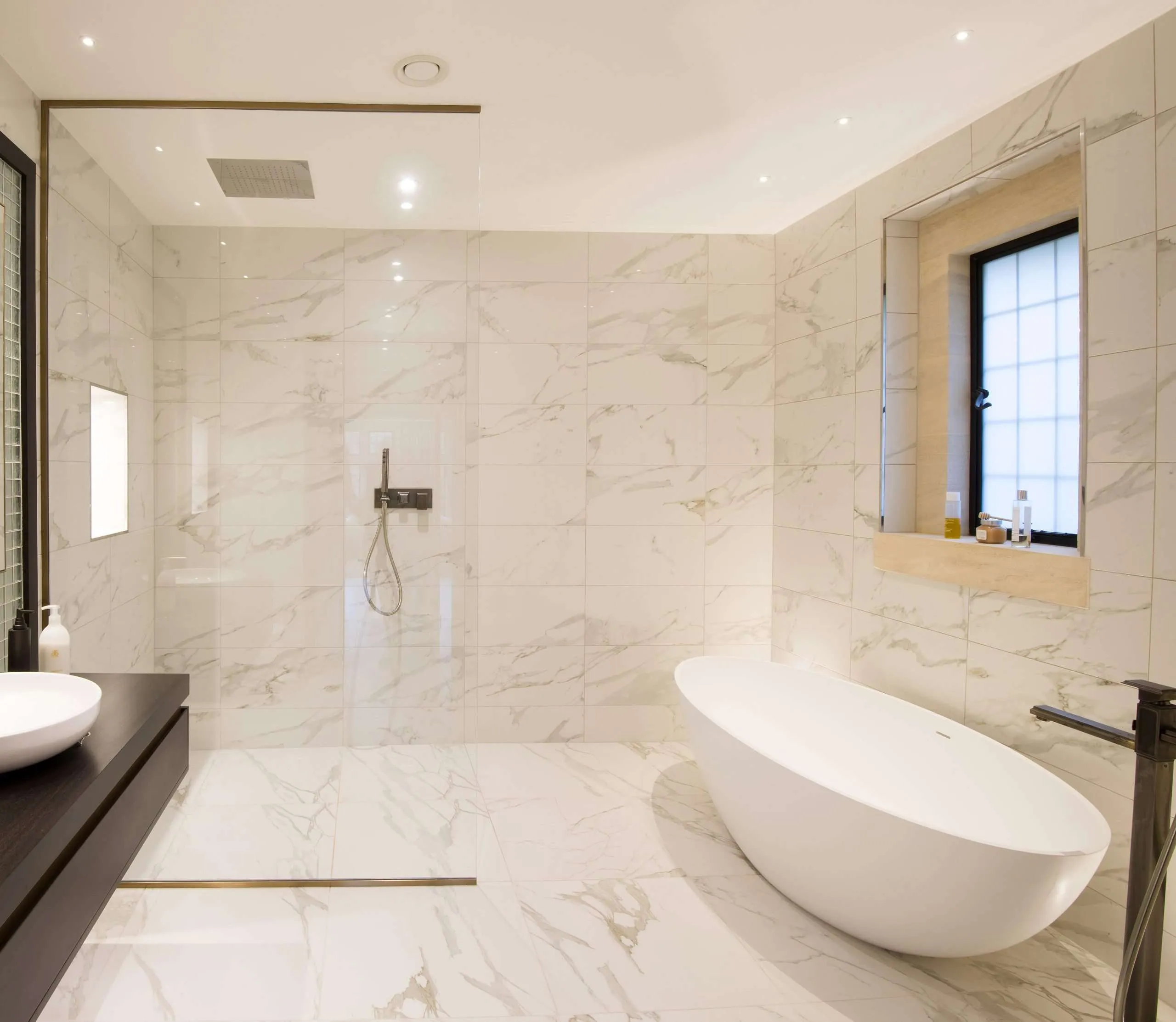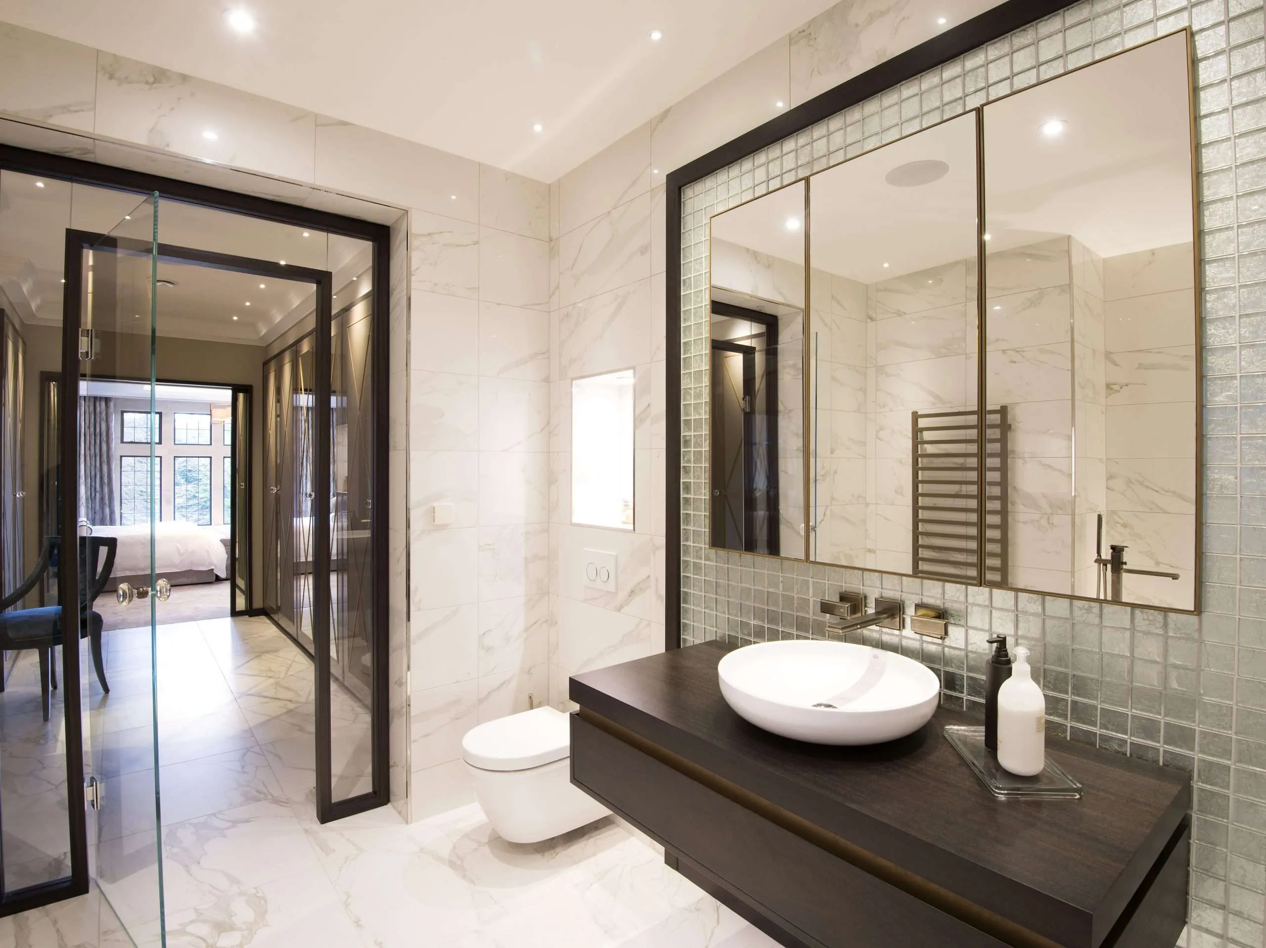The sense of understated glamour is reinforced with the use of large format marble floor tiles, atmospheric lighting and a faux suede chair in a decadent shade of rich blue.