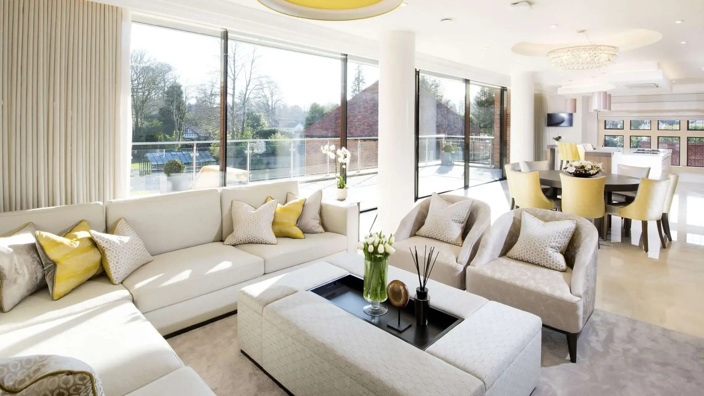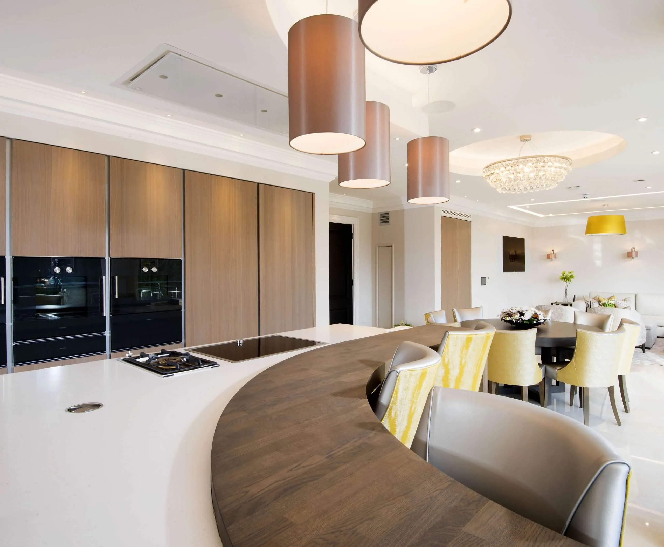 Throughout the space, our designers used lighting to great effect to help define the separate zonal spaces, whilst the layering of fabrics and accessories, with accents of yellow ochre, ensures a natural flow between the seating and kitchen areas.