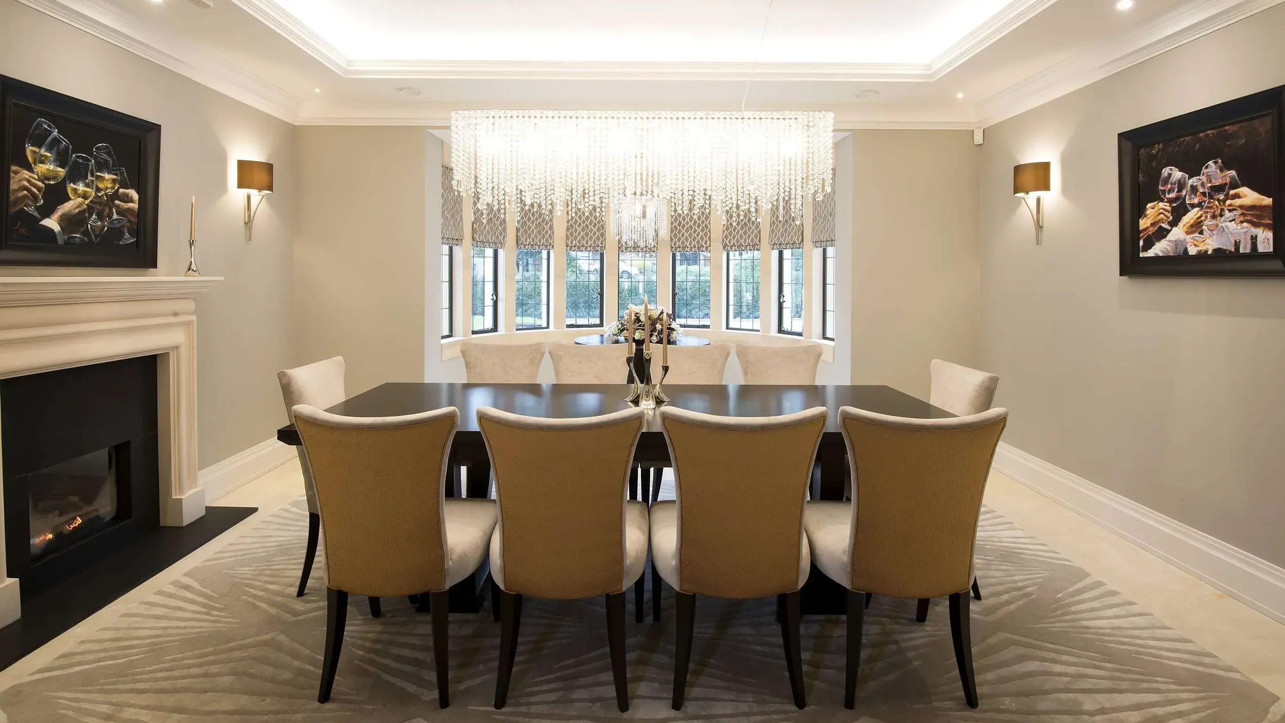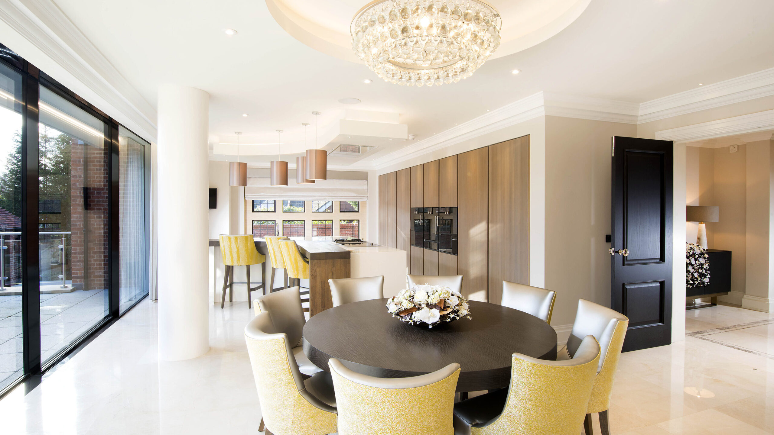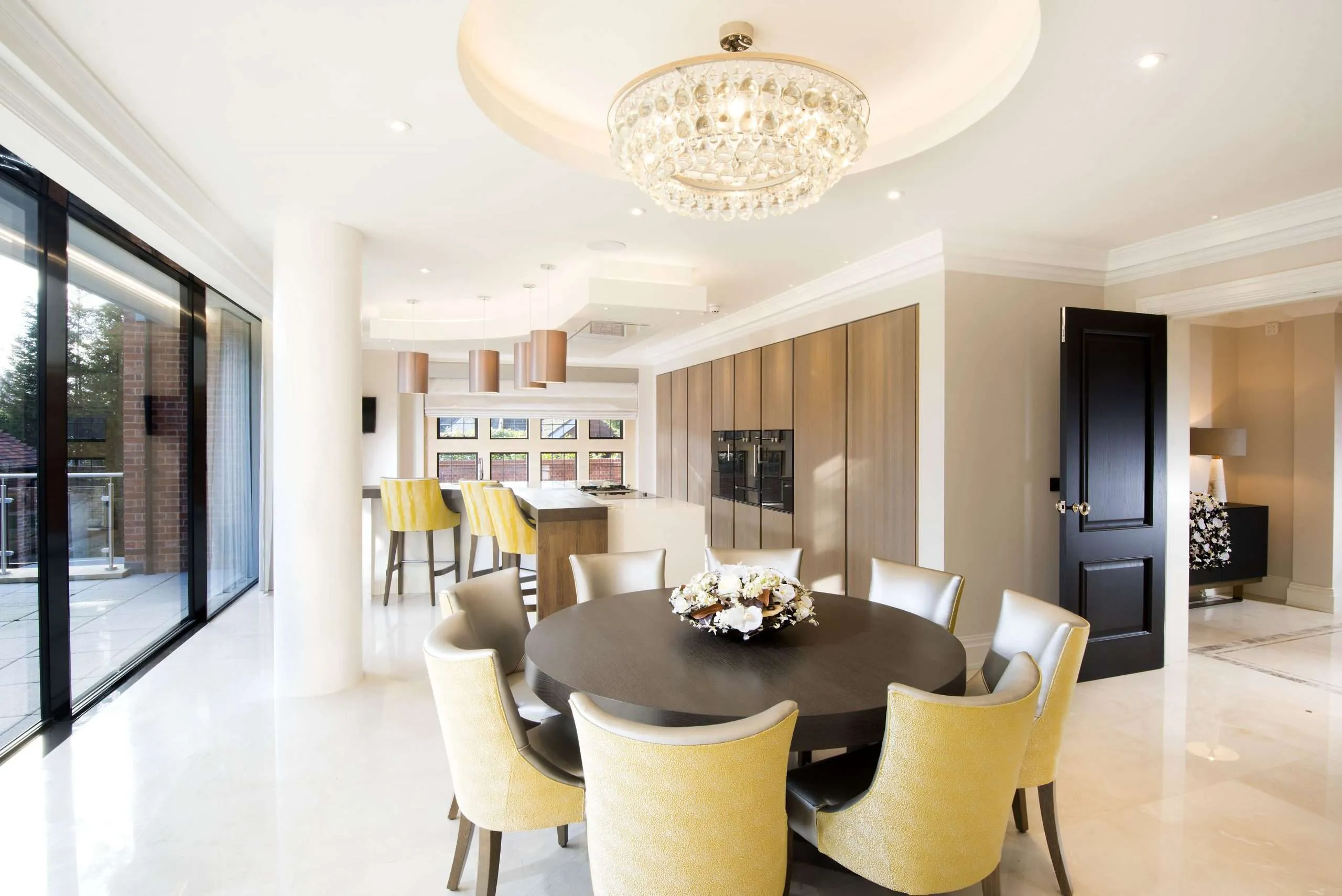 Dark stained double doors open from the hallway into a room that is designed to flood with natural light from the floor to ceiling glazed doors which offer stunning views over the garden. A feature pendant is set into a circular recessed ceiling area over the dining table highlighting it as a focal point in the room.