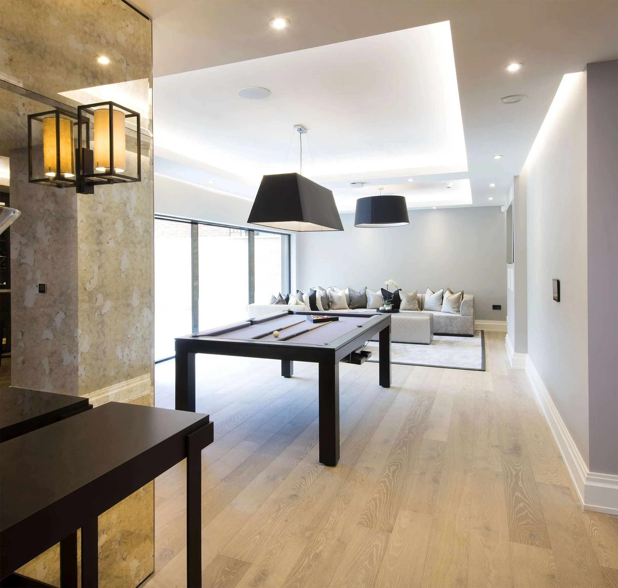 Beyond this, guests can glimpse the pool table area and media room which is decorated in the same tones as the bar to ensure an effortless synergy between the spaces