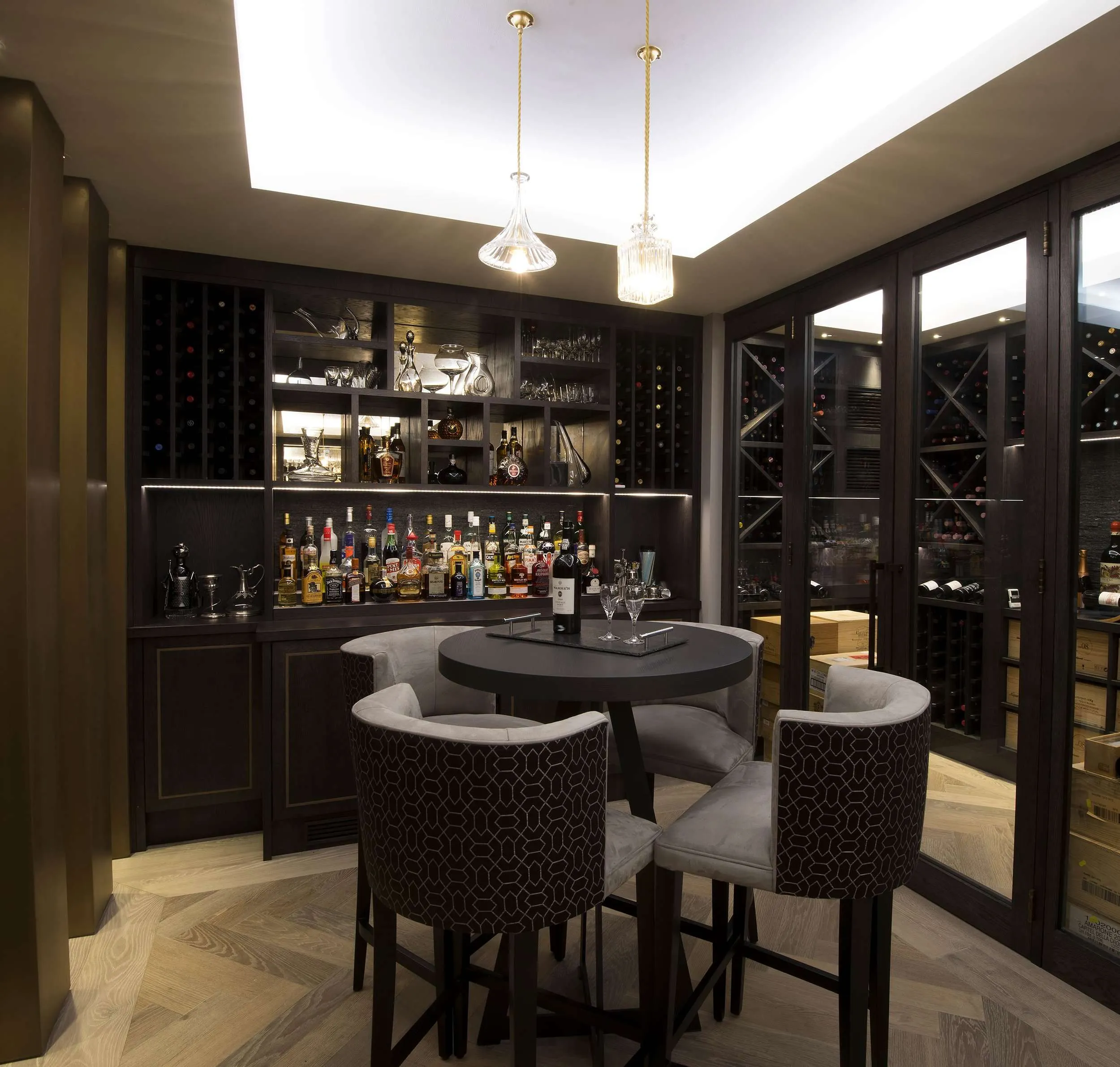To one side of the bar a curved sofa is set against an antiqued mirror panelled wall, whilst the farther side plays host to a spectacular wine room complete with a bespoke made bar in stained oak as well as a wine tasting table.
