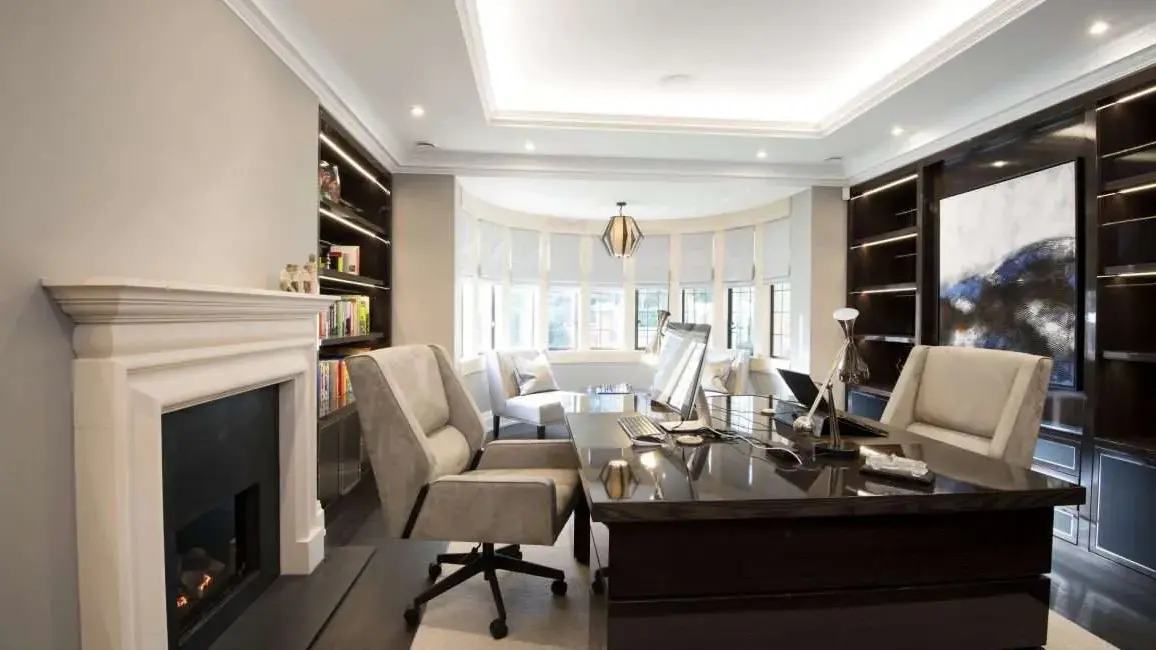 The study cabinetry is crafted in high gloss grey stained oak, with inset lighting details to the shelves and faux leather panel details. The focal point of the room is a high gloss partner desk with shadow gaps and inlaid leather writing pads.