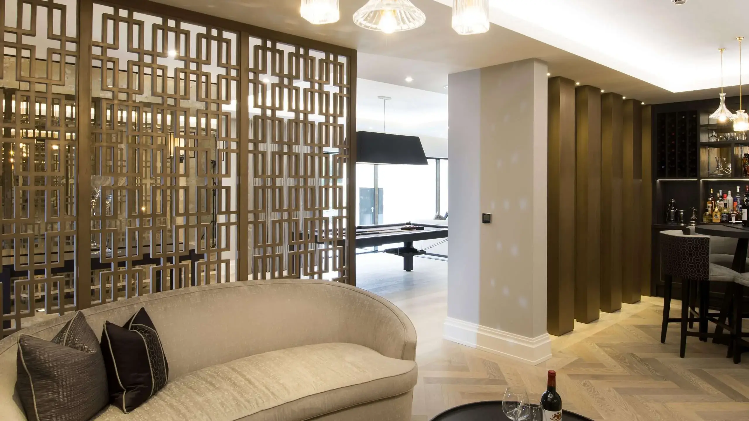 The basement houses the leisure and entertainment suite which offers a distinct change in tone with darker and more atmospheric hues. When entering the basement guests are welcomed into the bar and wine tasting area which is designed as a relaxed, social space.