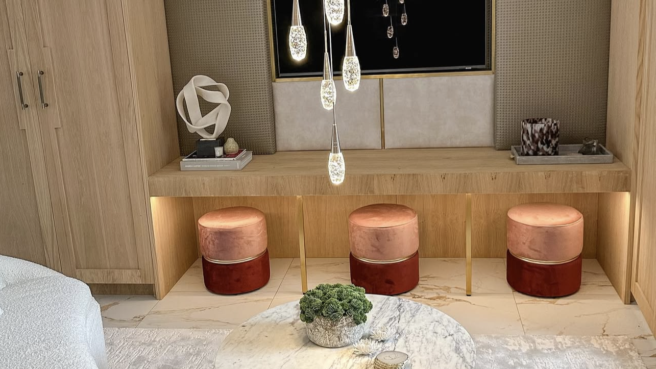 This cozy and stylish corner of the studio blends modern elegance with warmth, creating a calming space perfect for young families. The built-in wood cabinetry and soft beige tones set a serene mood, while the trio of blush velvet stools add a playful, luxurious touch. The sparkling drop pendant lights and marble-topped coffee table create a sophisticated focal point, ideal for welcoming clients and showcasing printed albums or products in a relaxed setting.
