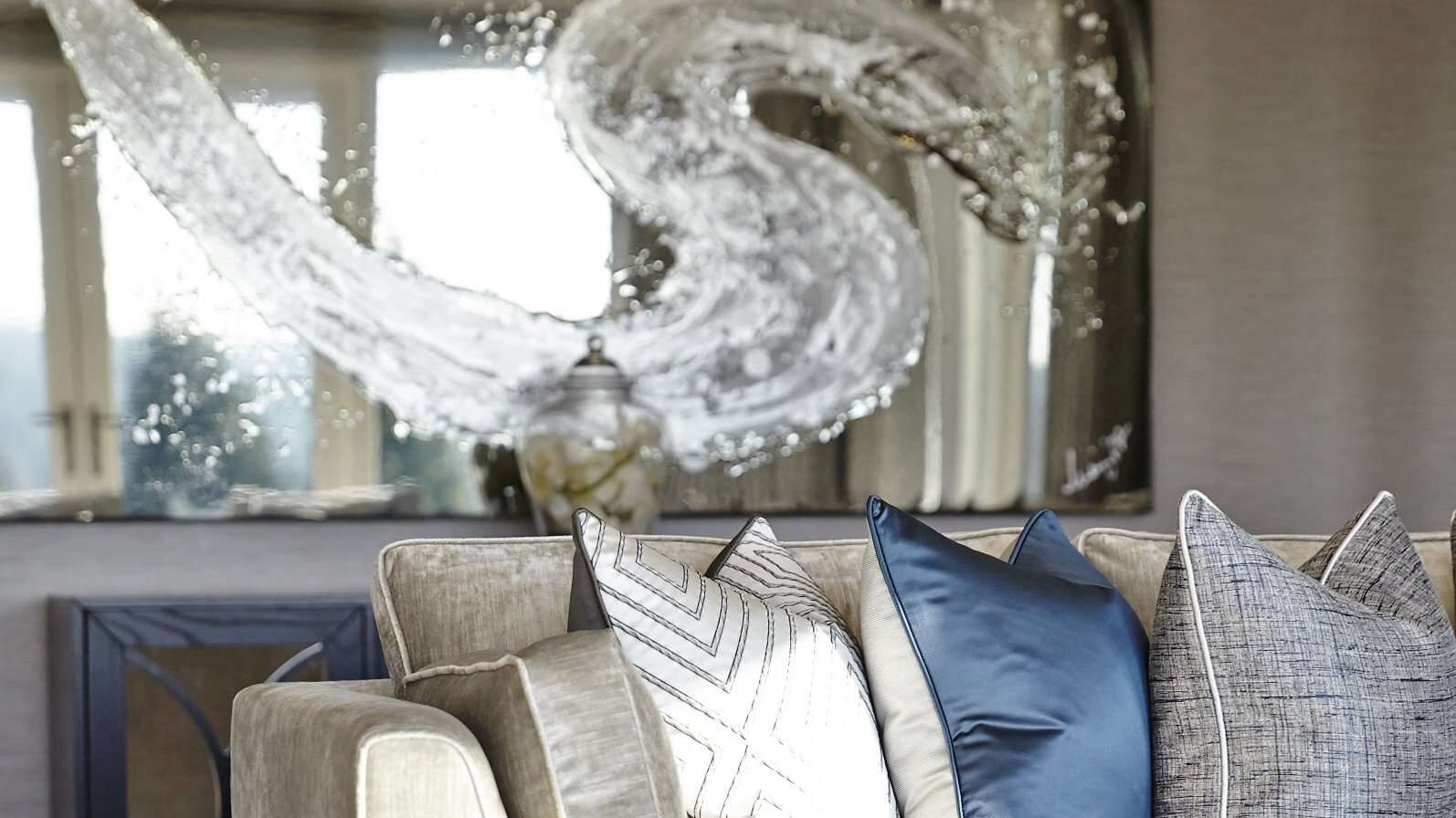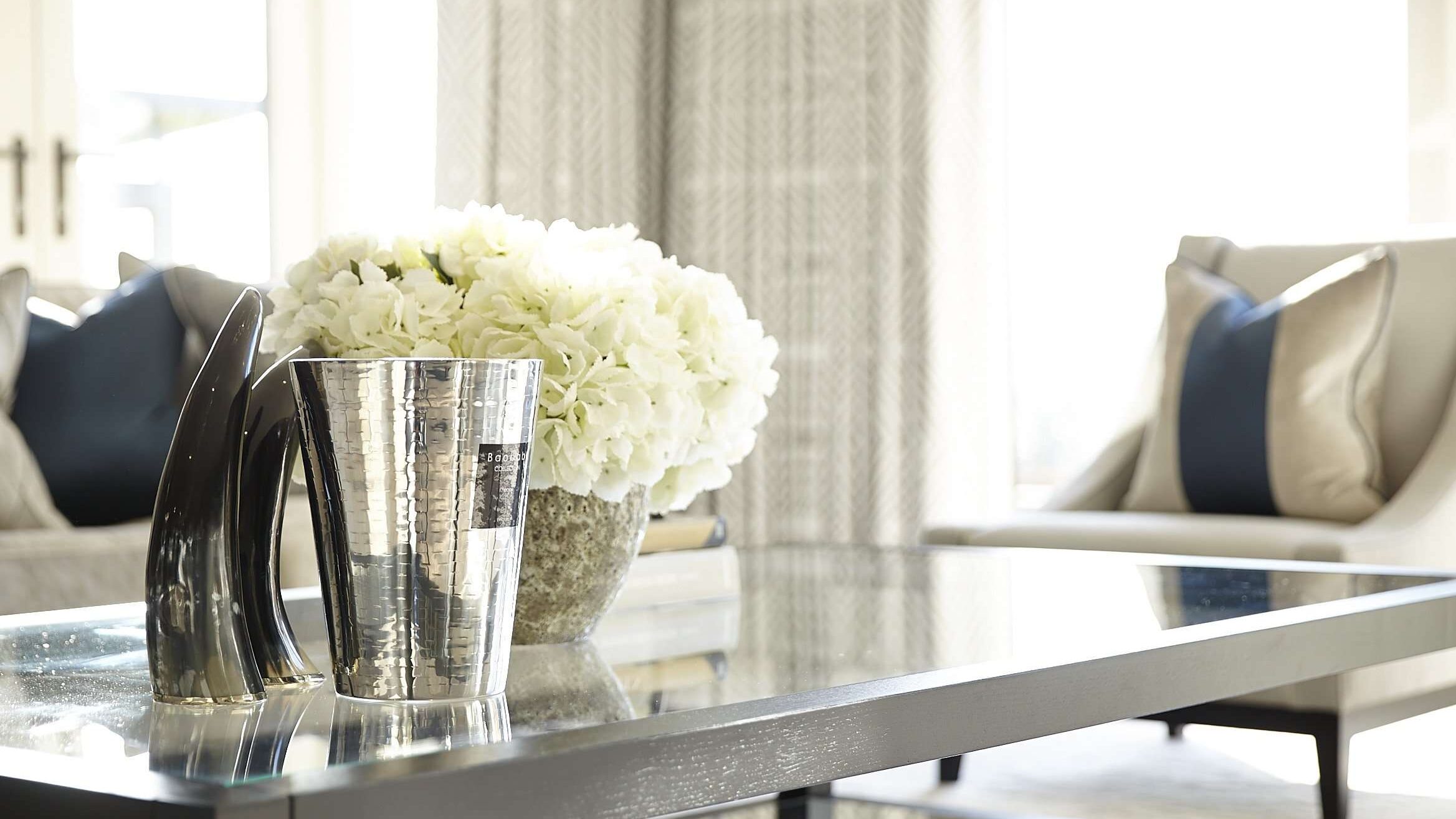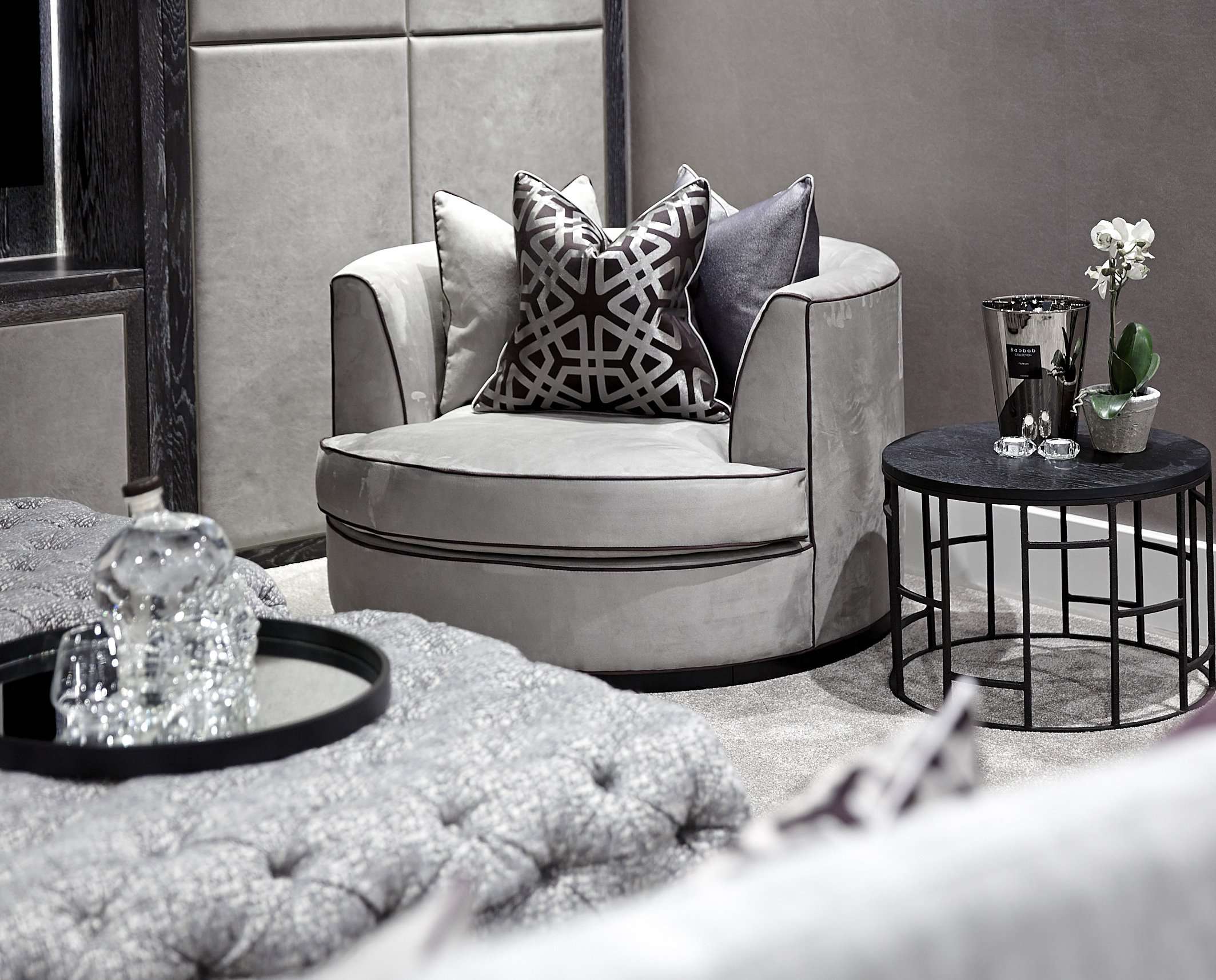 Scatter cushions on the sofa and occasional chairs allude to comfort and refined relaxation whilst the placement of accessories from our sister company UBER Interiors such as a textured stone bowl in earthy tones filled with fresh flowers and Baobab scented candles create an atmosphere of understated luxury.