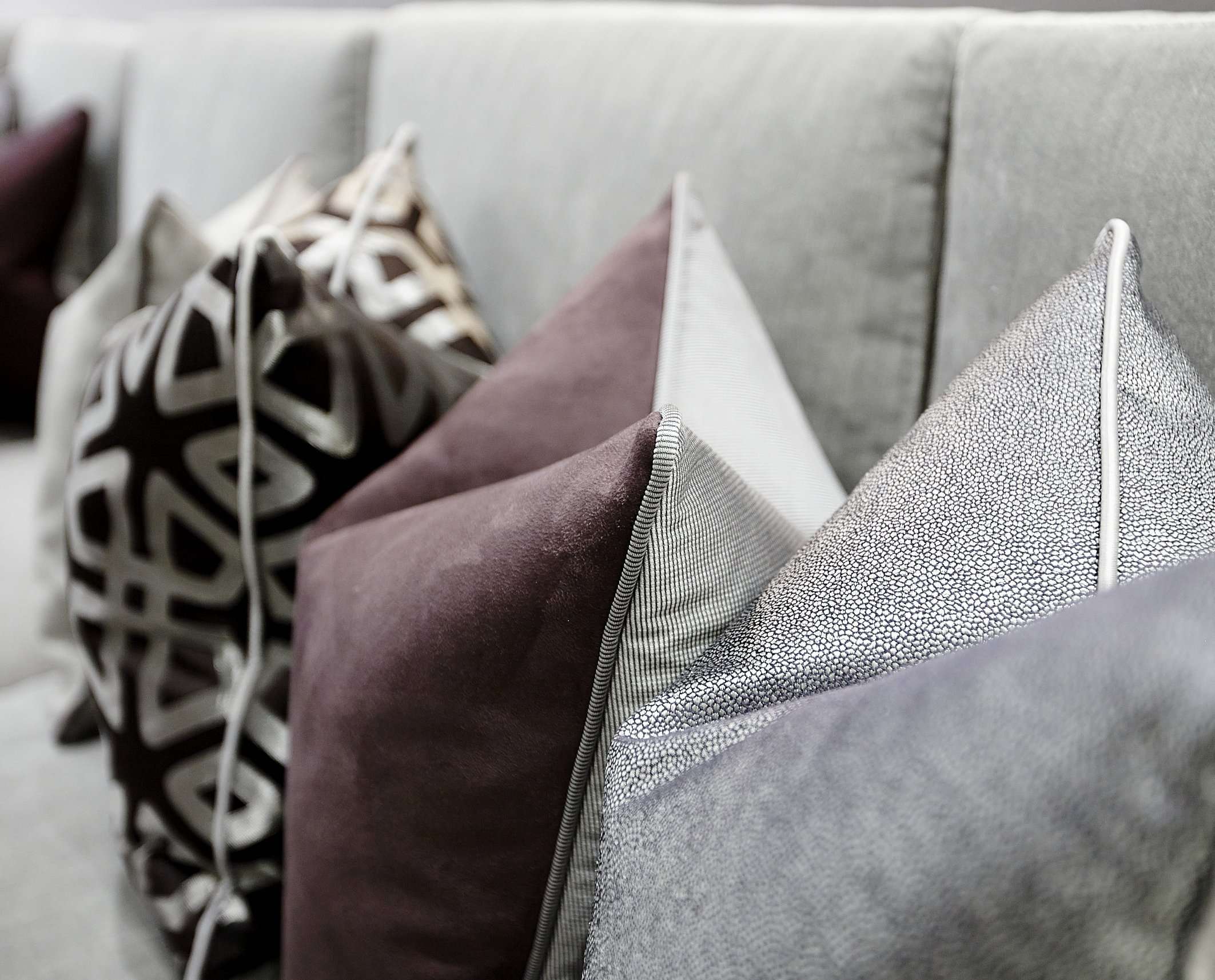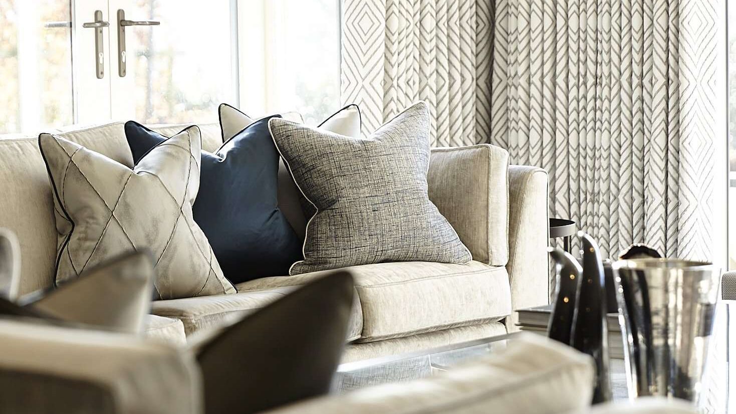 We used a variety of textures and materials throughout to create a feeling of understated comfort. Large-scale neutral geometrics and mottled textures that sit alongside velvets and soft satins in tones of rich blues and silvery greys. Whilst the neutral tones used in the triple pinch pleat curtains create an impact in the space without being too overpowering.