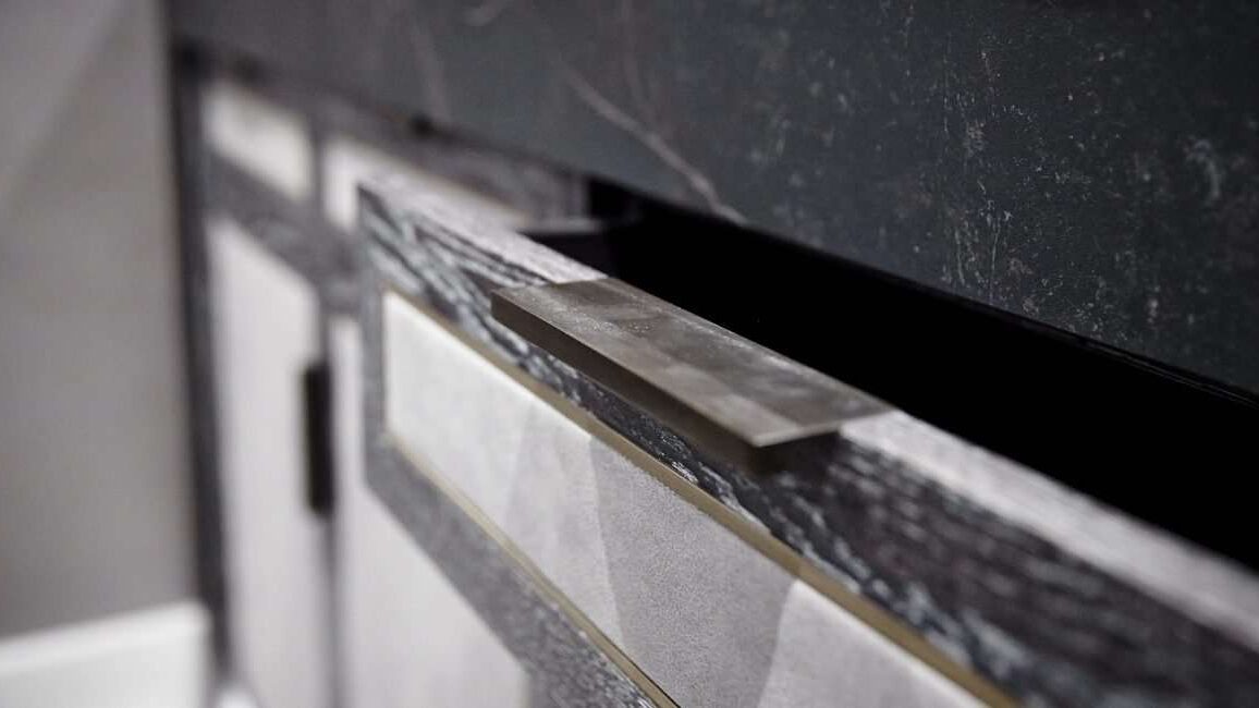 The cabinetry is offset perfectly by the stunning faux stone worktop and the cupboards showcase a wealth of intricate details including leather inlay panels, antique bronze trim and antique bronze edge pull handles.