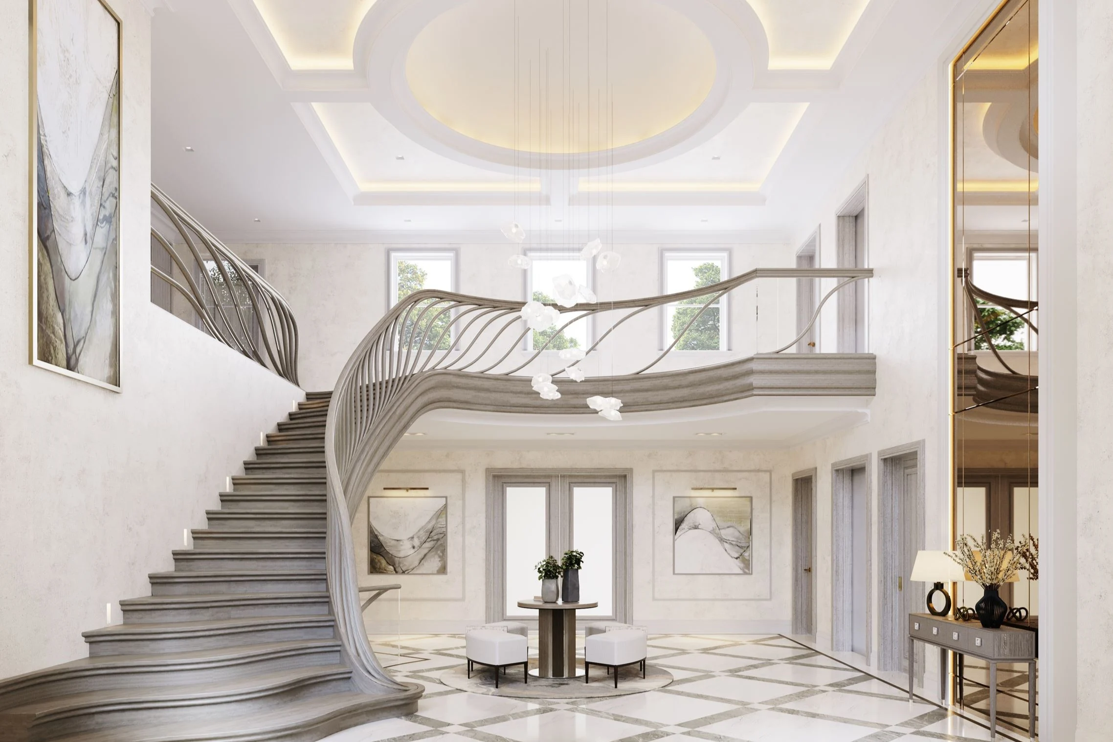 The staircase in the trendy London restaurant, The Hide, London, significantly shapes the entrance hall design in our project. To build upon this inspiration, our design introduces a striking staircase that spirals organically, seamlessly incorporating organic materials and shapes to enhance its natural beauty.