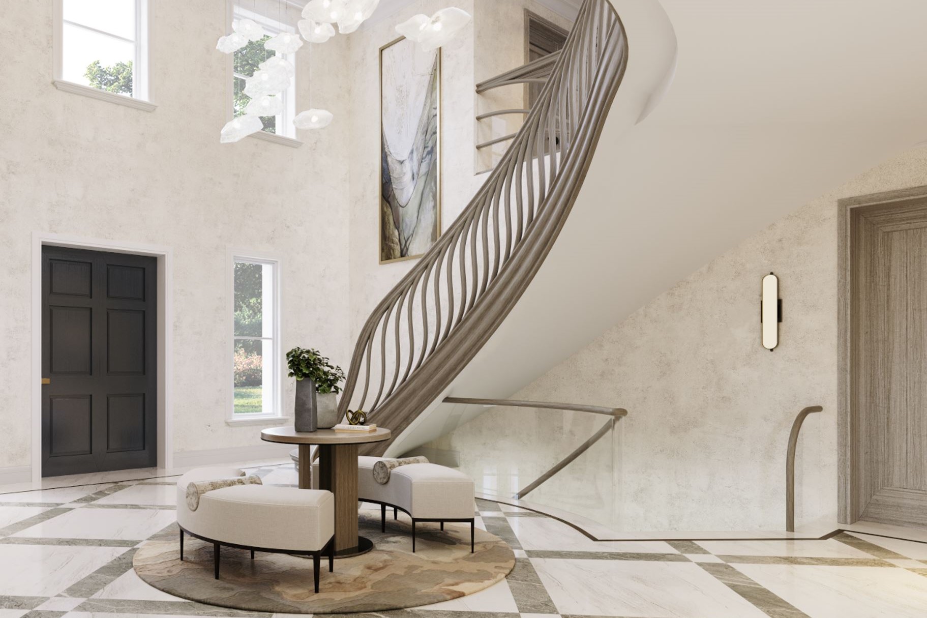 Additionally, the staircase elegantly frames a circular table at its base, further establishing it as the space’s focal point. Above, a cascading pendant light takes centre stage, drawing the eye as it hangs from the deep dome ceiling detail. Consequently, this dynamic combination not only delivers a dramatic yet inviting atmosphere but also effectively sets the tone for the entire property. Ultimately, the entrance hall radiates sophistication, ensuring guests experience an unforgettable first impression.