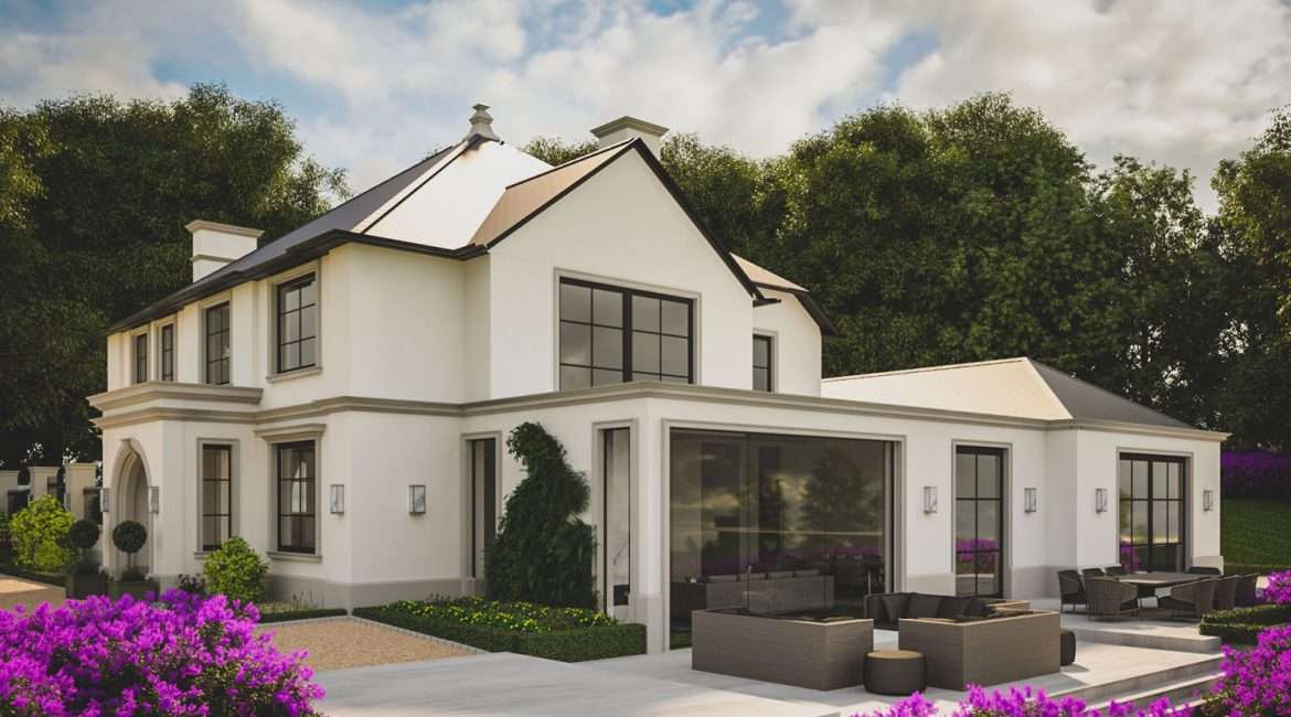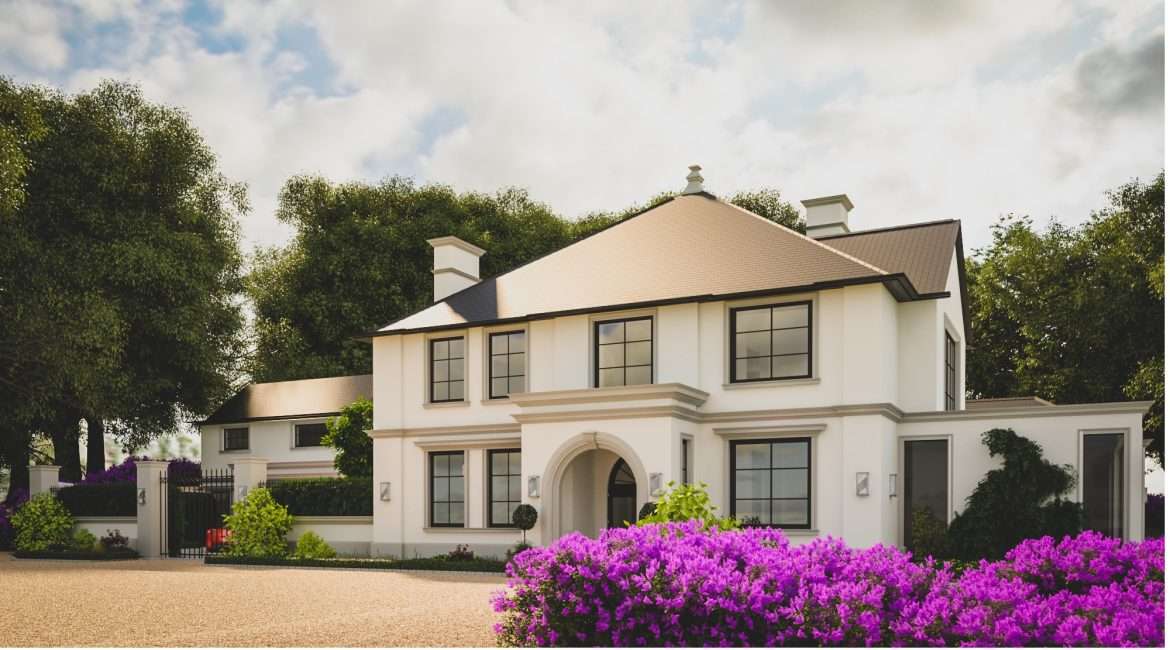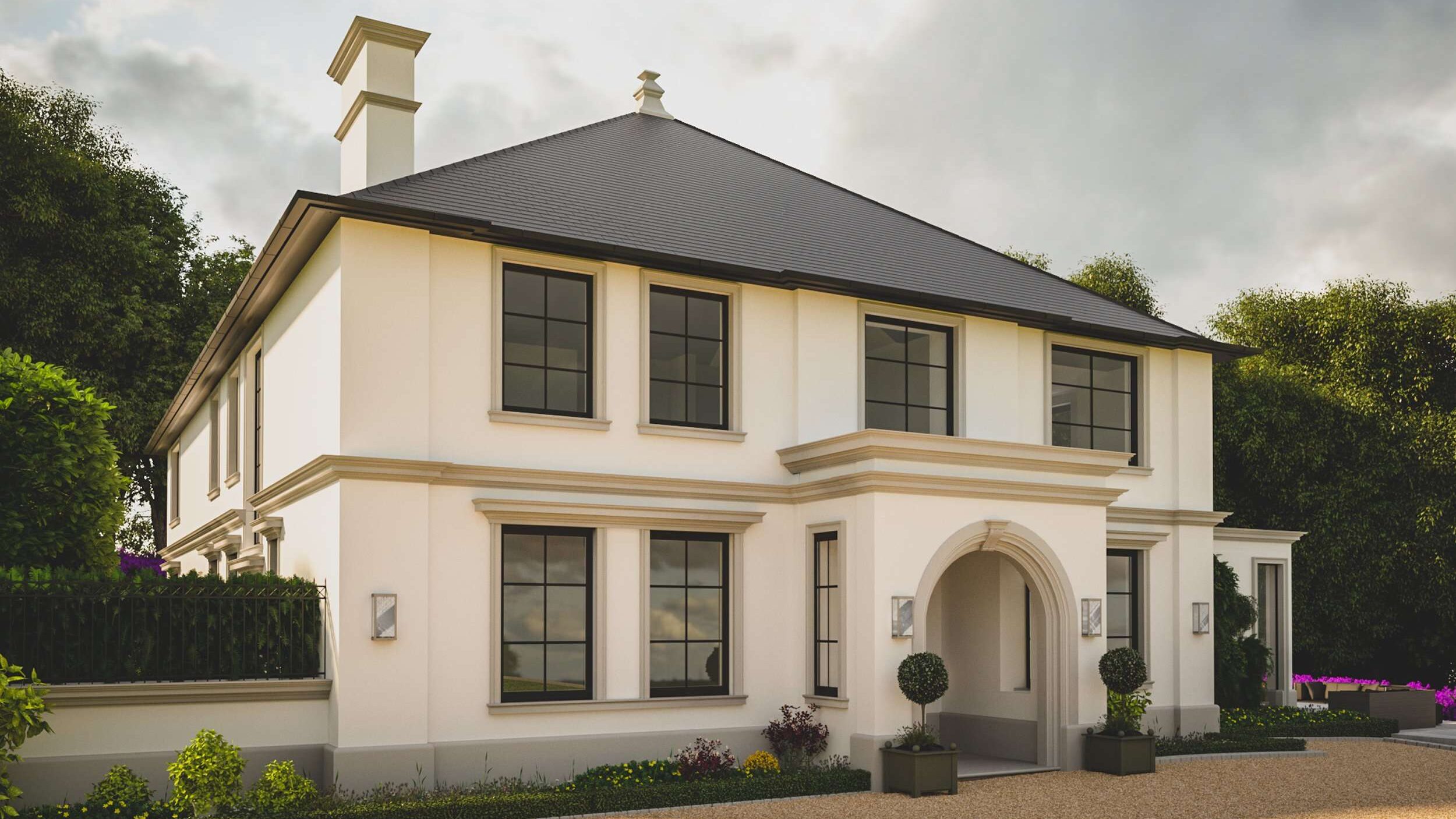 Our proposals detailed a full render of the exterior whilst softening the look with a number of profiles in bath stone, namely, a band course, string course and parapet walls. New chimneys with charming decorative details were added and the roof re-skimmed with Spanish slate.