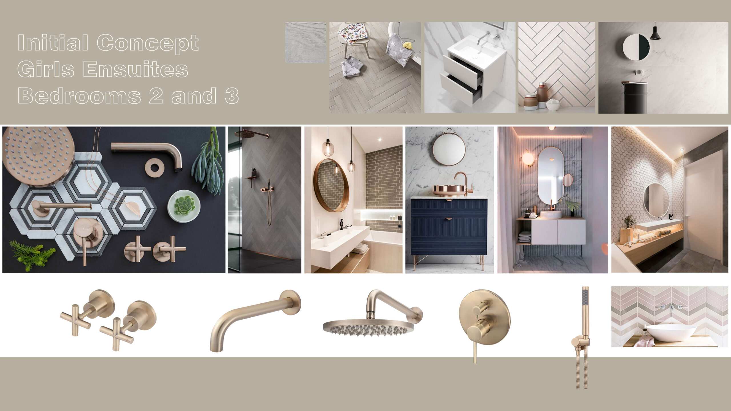 The younger daughter, with a passion for pink, has a feature wall of blush pink tiles in a herringbone format in her bathroom, whilst the elder child enjoys the more muted tones of timber effect ceramics on the walls and floor.