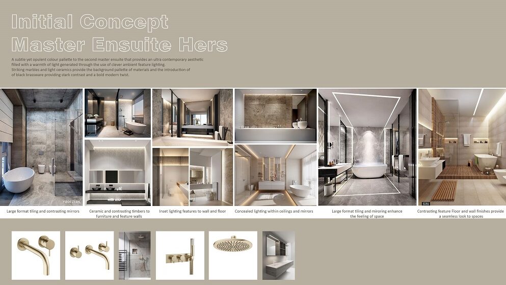 The suite itself is styled with understated simplicity, the bedroom is designed with luxurious finishes whilst the dressing room is fitted with floor to ceiling cabinetry and displays. The space flows through to the master en suite which is designed in calming earthy tones. Both the floor and walls are swathed in ultra large format tiles which create the illusion that the space is hewn from rock. Adding to the atmosphere, feature niches are illuminated with LED lighting and additional halo lights are used to subtly alter the mood. This room was designed to heighten the senses and create a feeling of being at one with nature.