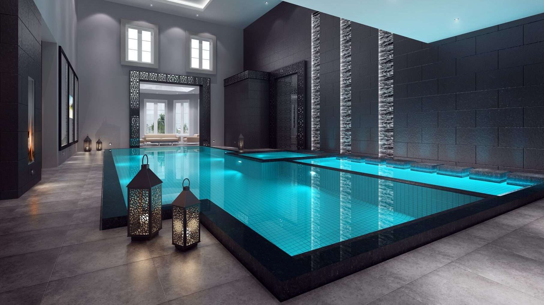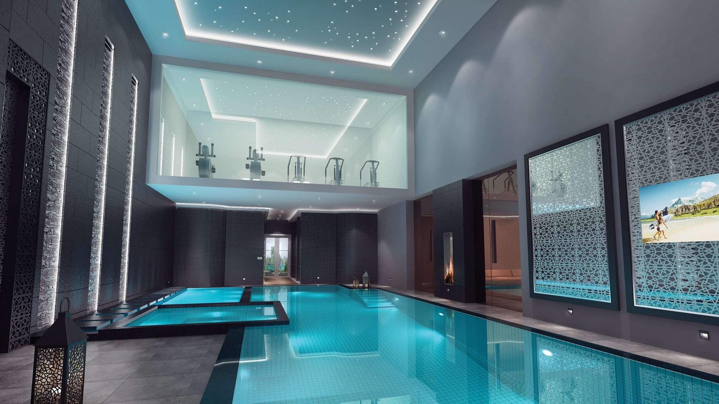 Turkish influences in the décor such as the mirror detailing in the pool and the hamman. – The client’s wife was Turkish and wanted to bring some of her culture into the décor. It seemed an obvious place would be to design this in to the leisure facilities where a Turkish Hamman was the pinnacle of the space. Moorish designs were detailed into the pool side mirrors, leading the eye towards the oversized hamman doors with their ornate handles.