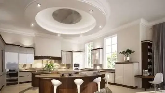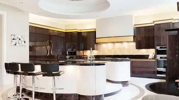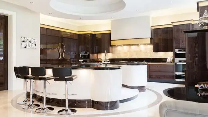 The bespoke high gloss kitchen with circular island detail that contained a Tepan station was designed to create a ‘theatre’ of a kitchen, a central stage tepan station where children could be entertained in the preparation and cooking of every meal.