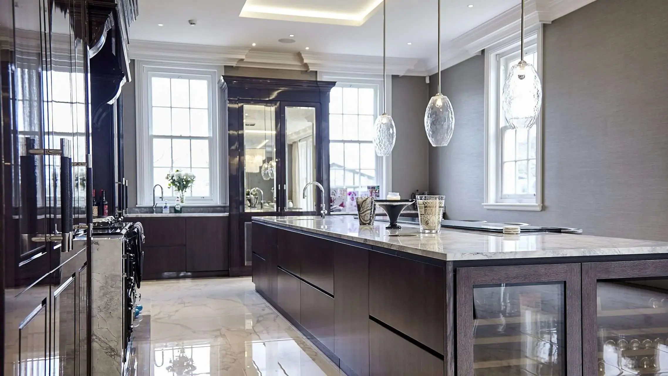 Worktops sculpted from polished Bianca Eclipsia Granite sit above the cabinetry offering the perfect complement to the rich colour of the wood.