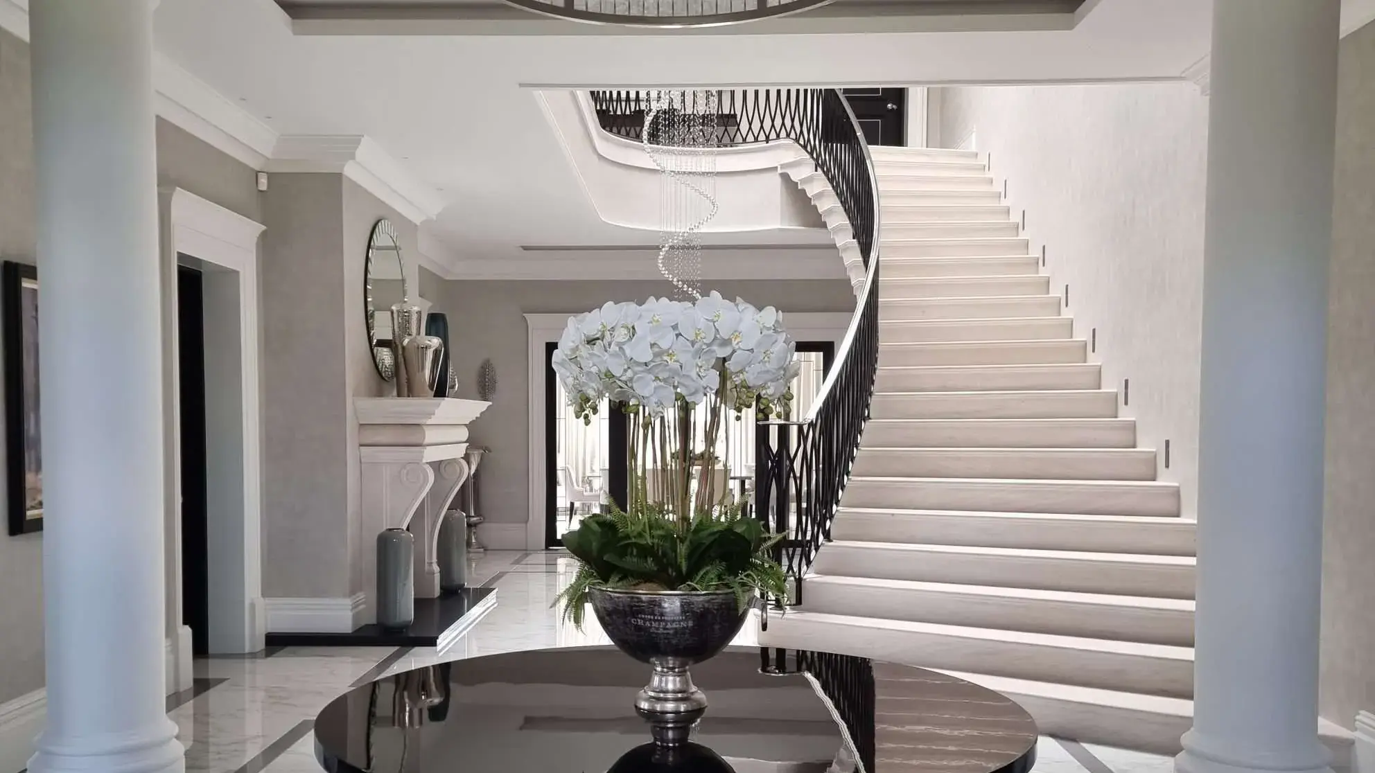 Sitting above the three floors of this wonderful staircase sits a stunning glass dome we designed which radiates plenty of natural light through these floors. Cascading through the centre of each floor hangs a show stopping 9 meter chandelier which elegantly hangs from the glass dome in the roof of the property, spiralling down to the grand entrance lobby