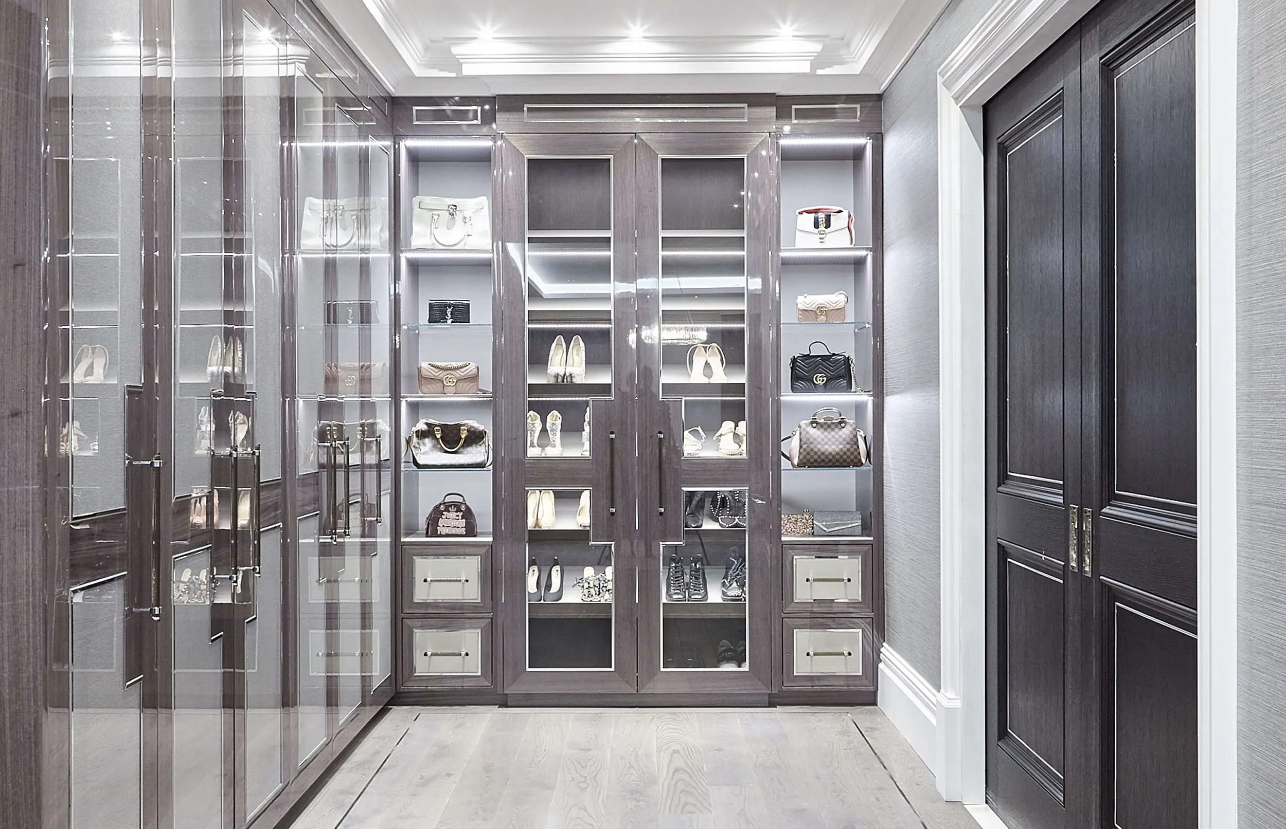 The master dressing room rivals the kitchen in terms of the scale of the cabinetry specification. It is arranged with almost 360-degree storage and display units as well as a centre island.