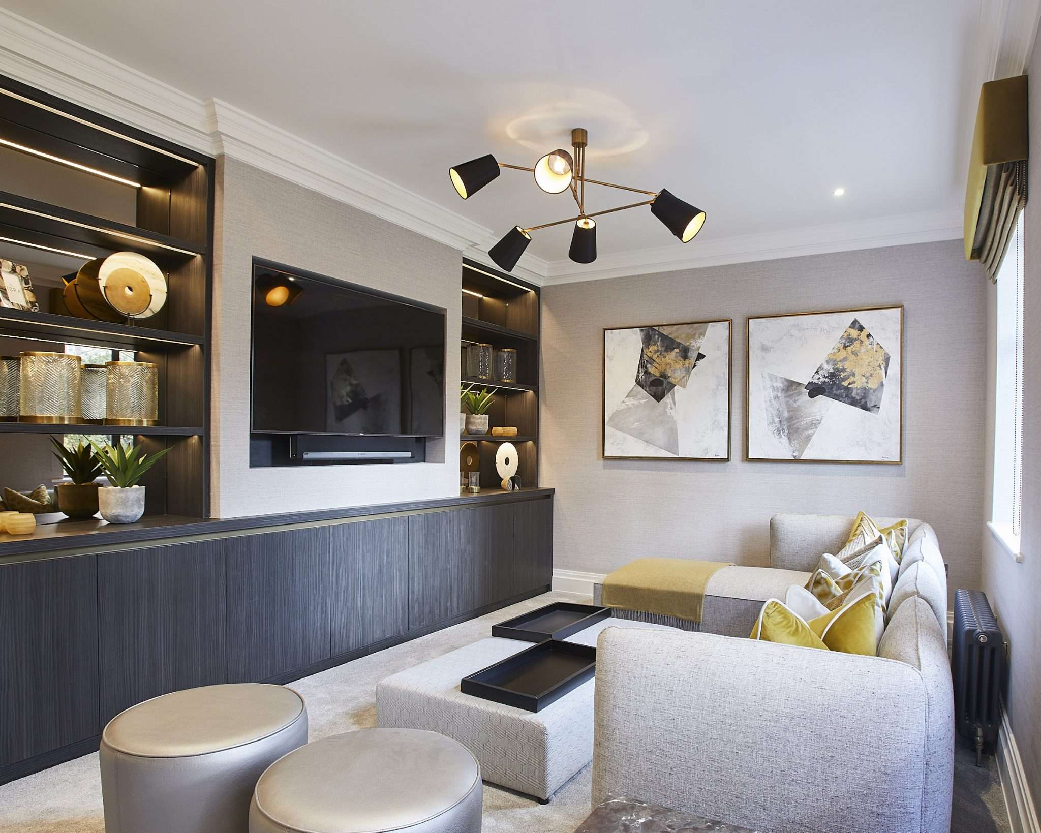 The focal point of the cinema area is a feature fireplace media wall boasting modish upholstered panels with brass inlay details which are designed in a contemporary geometric style.