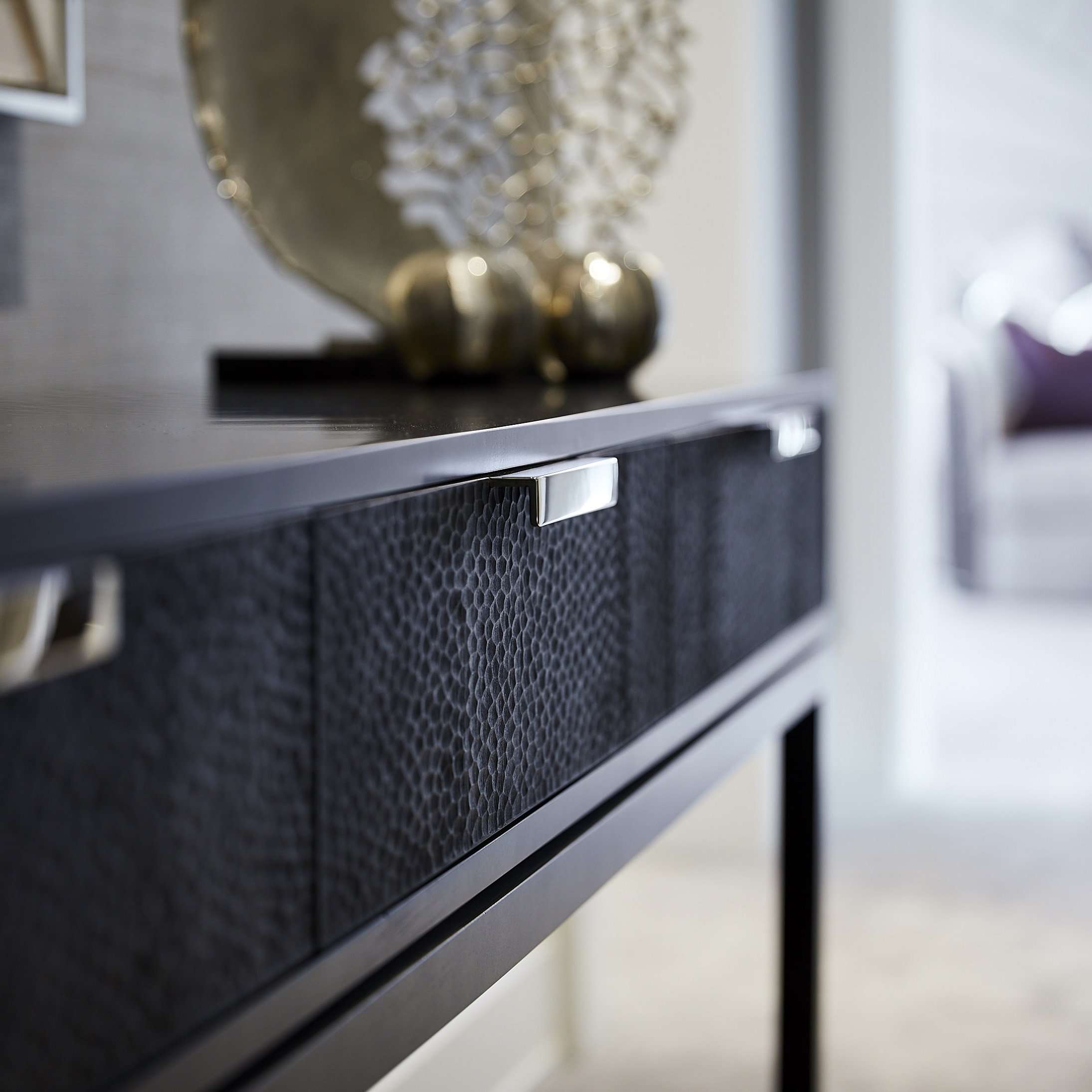 The oversized TV is positioned above the ribbon gas fire and niches on either side feature atmospheric backlit onyx panels.
