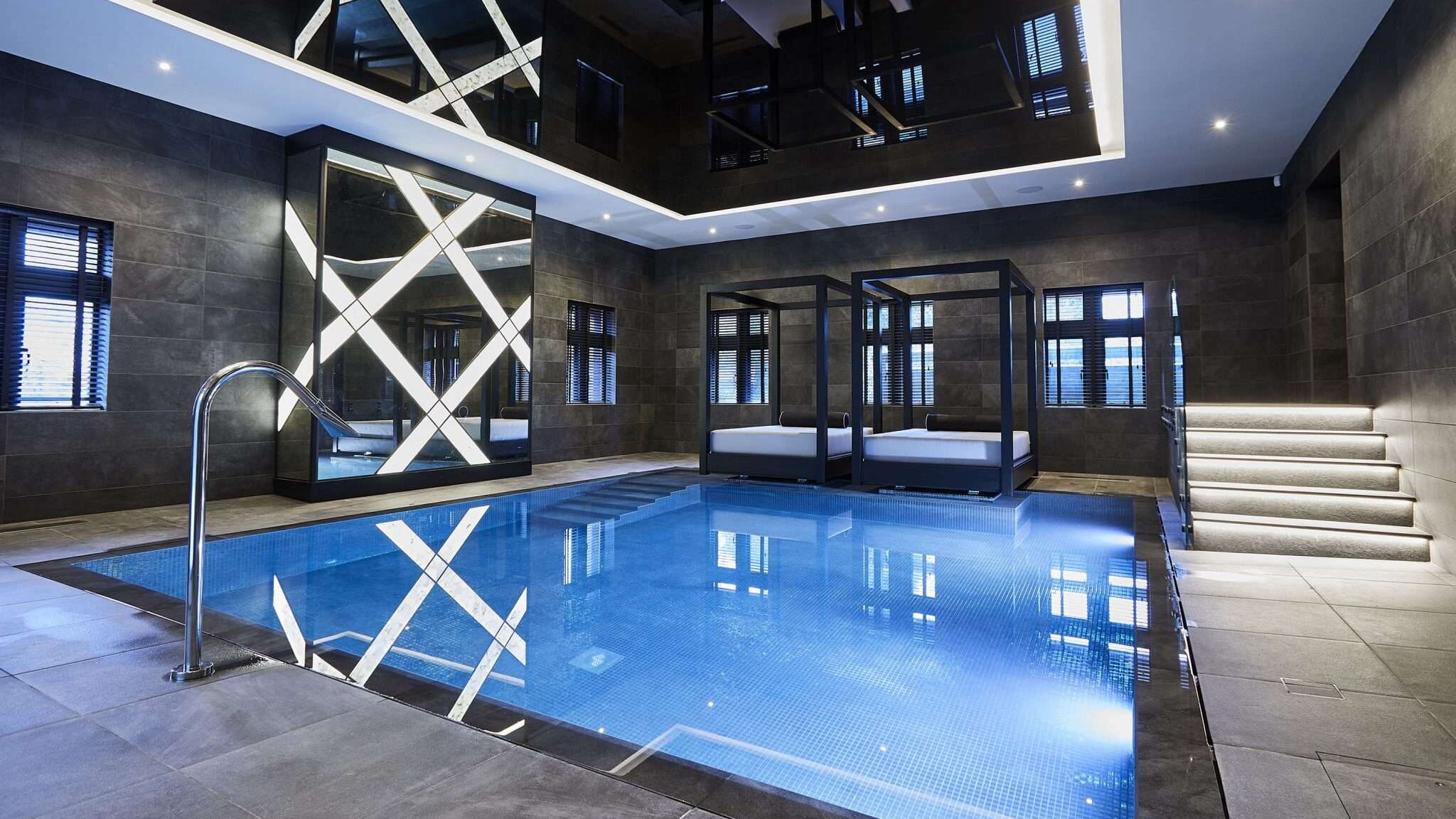 The pool is flanked by a feature wall crafted from a diamond design of backlit onyx and antique mirror paneling.