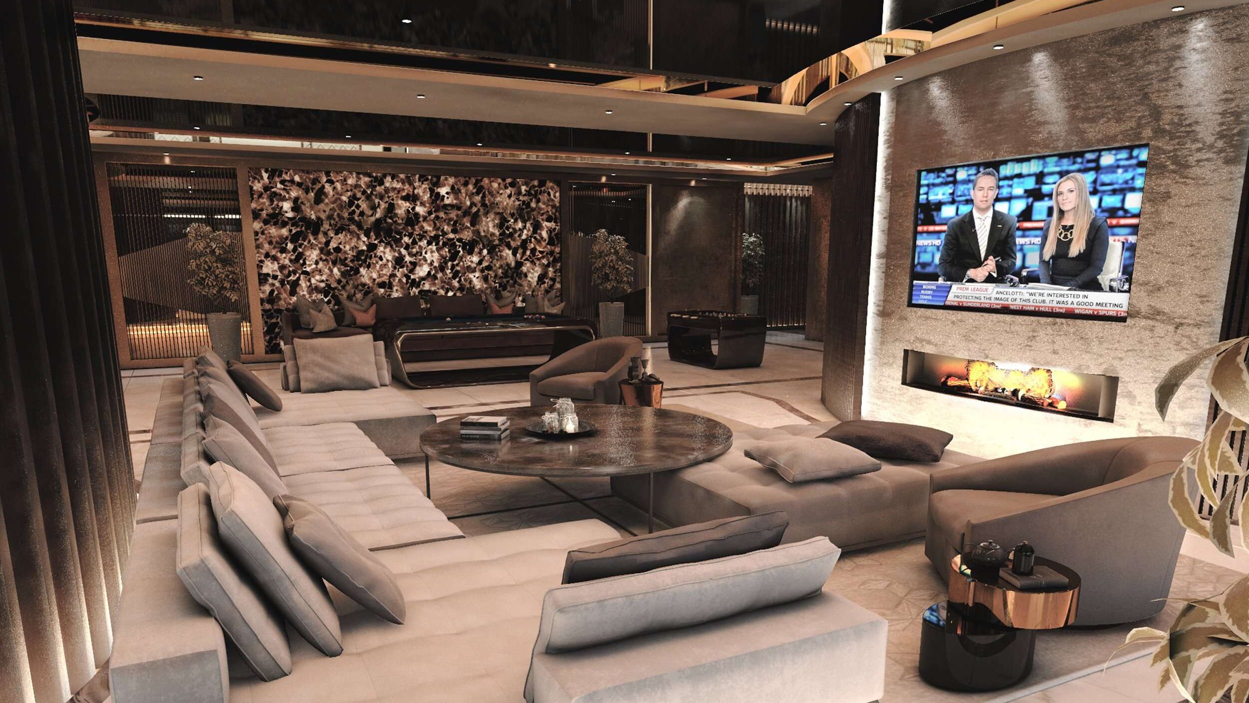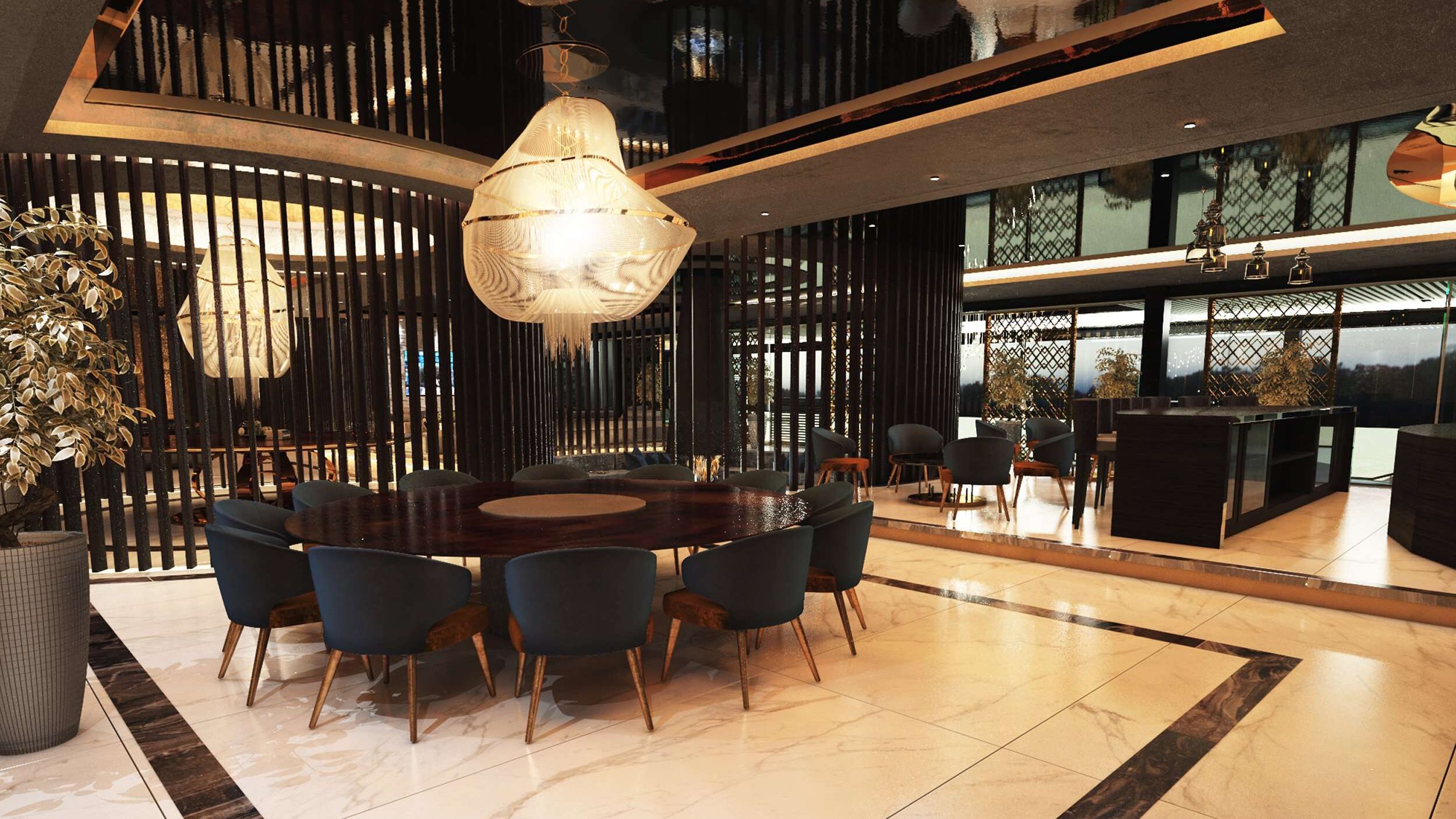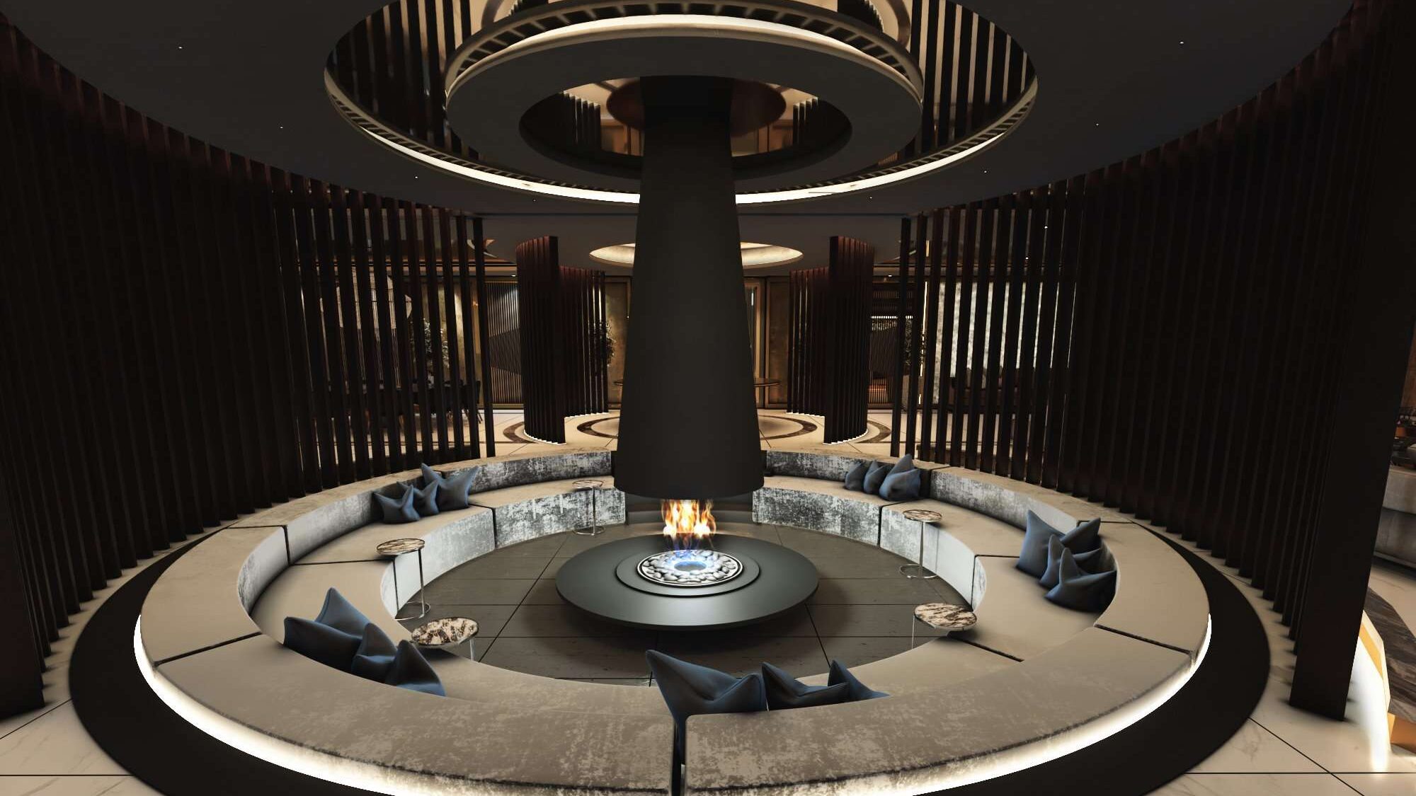 A circular entrance hall with louvered screens offers glimpses into the different zones, piquing guests’ curiosity. A central meeting area is an important part of the space and features sunken seating around the central firepit. It is designed with special finishes and exceptional lighting to create a visually aesthetic space.
