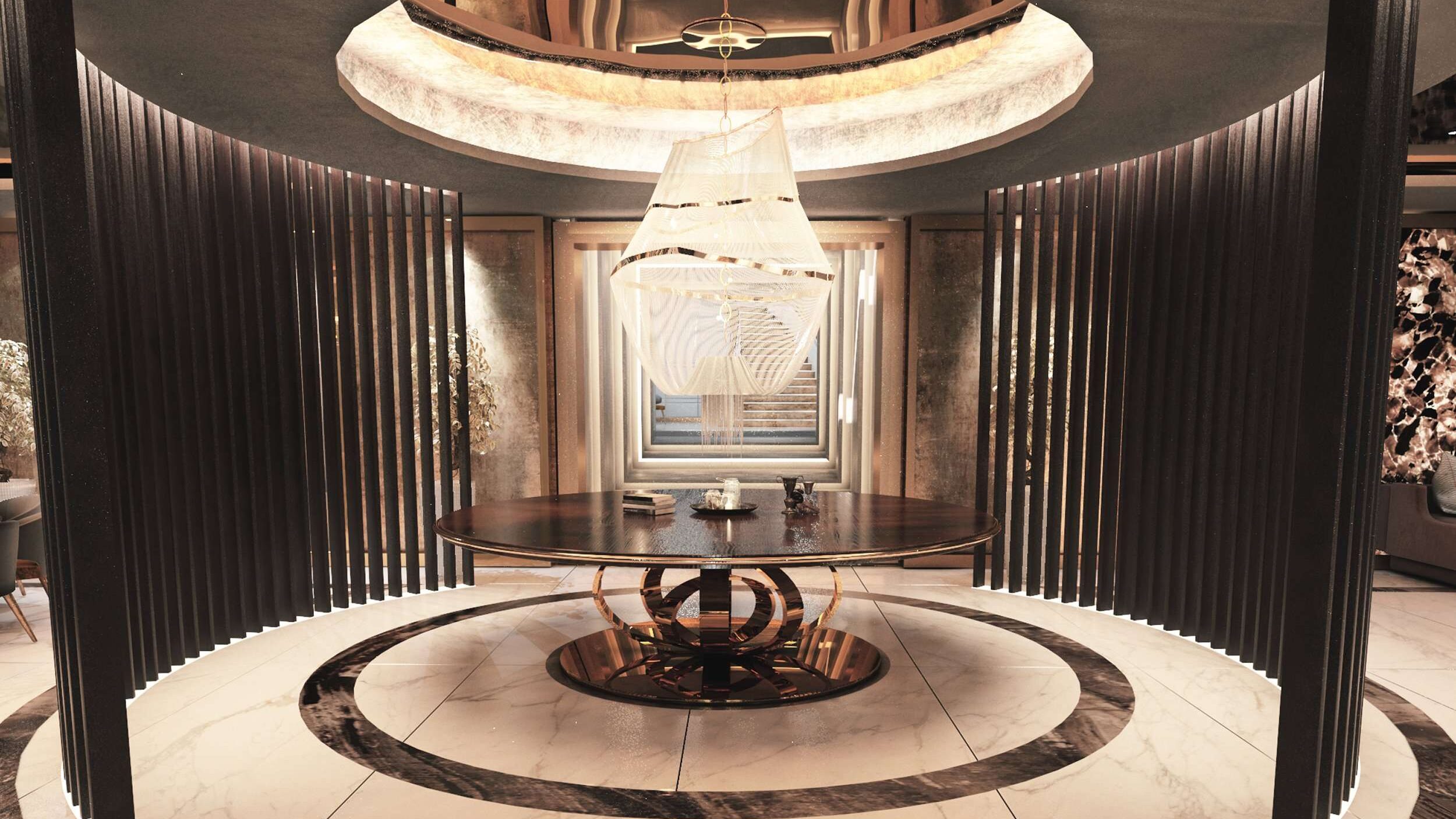 One such space is the dining area with a bespoke polished wood table and statement chandelier.