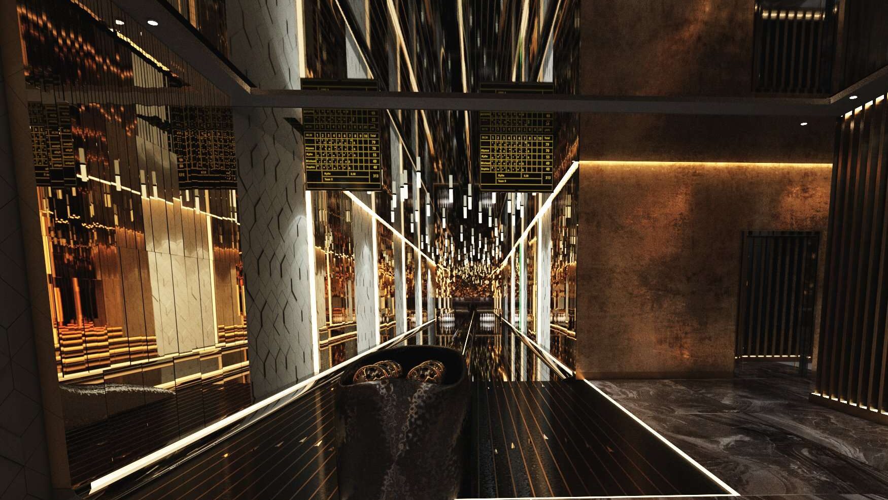 With geometric textured wall coverings, each step has perimeter illumination detailing which creates separate zonal sections, guiding the guest deeper into the subterranean experience with each step.