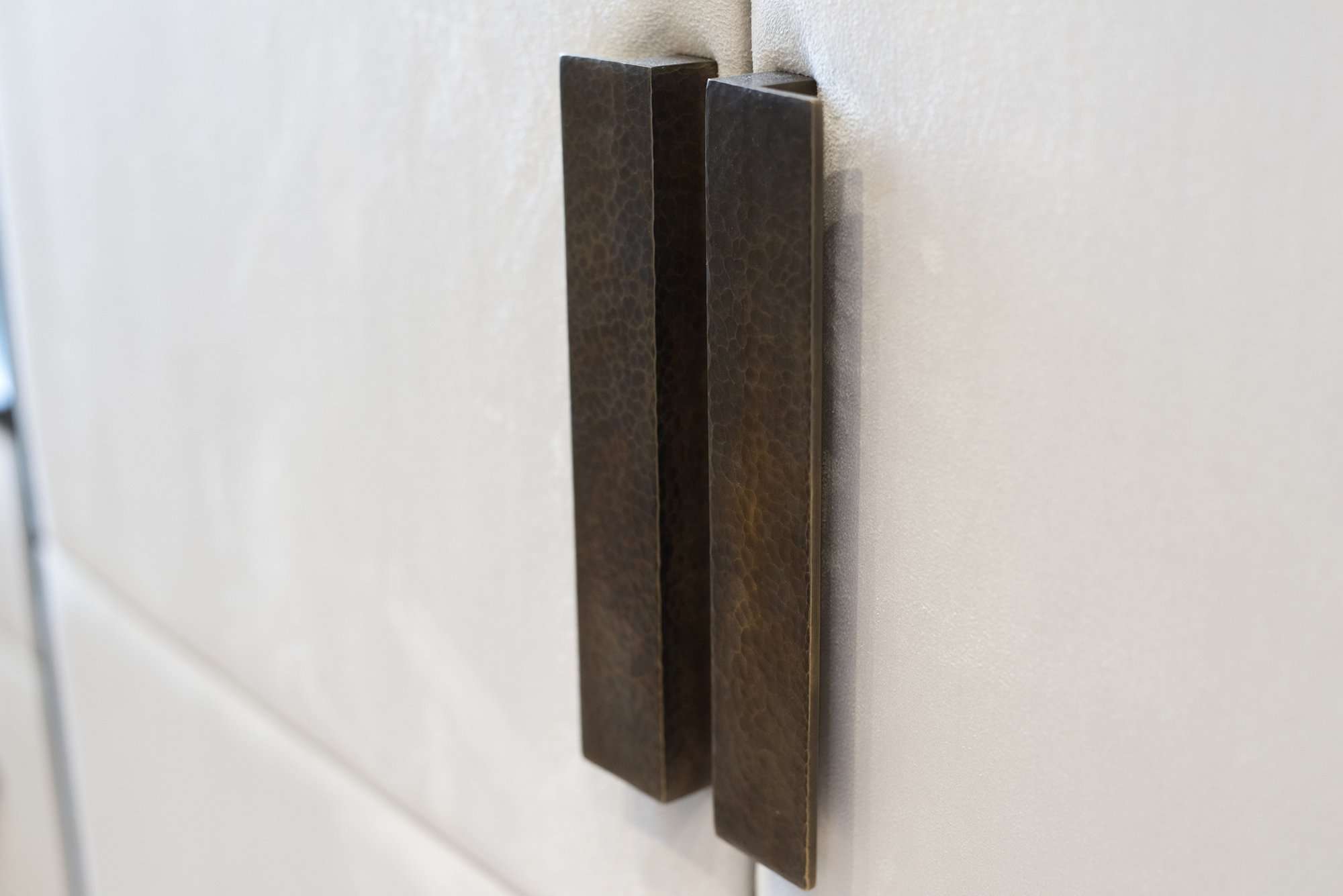 A sideboard in stained timber with mirror panels to the door and an intricate timber pattern detail graces one wall whilst above it sits a piece of bespoke feature artwork. With accents of blue, this artwork was chosen for continuity with the light shades and to offer cohesion to the scheme. We dressed the dining space with accessories in rich bronze tones to add warmth and character to the room.