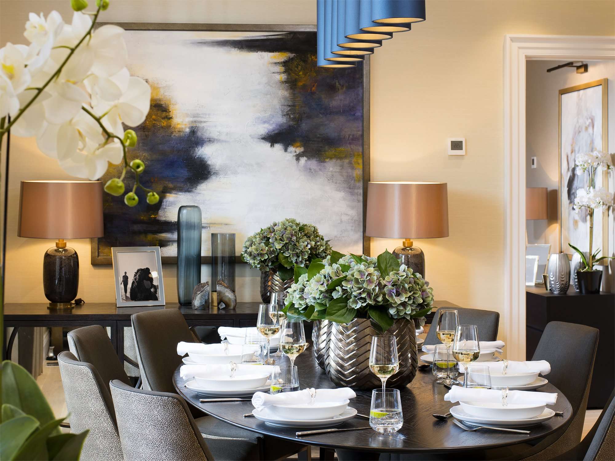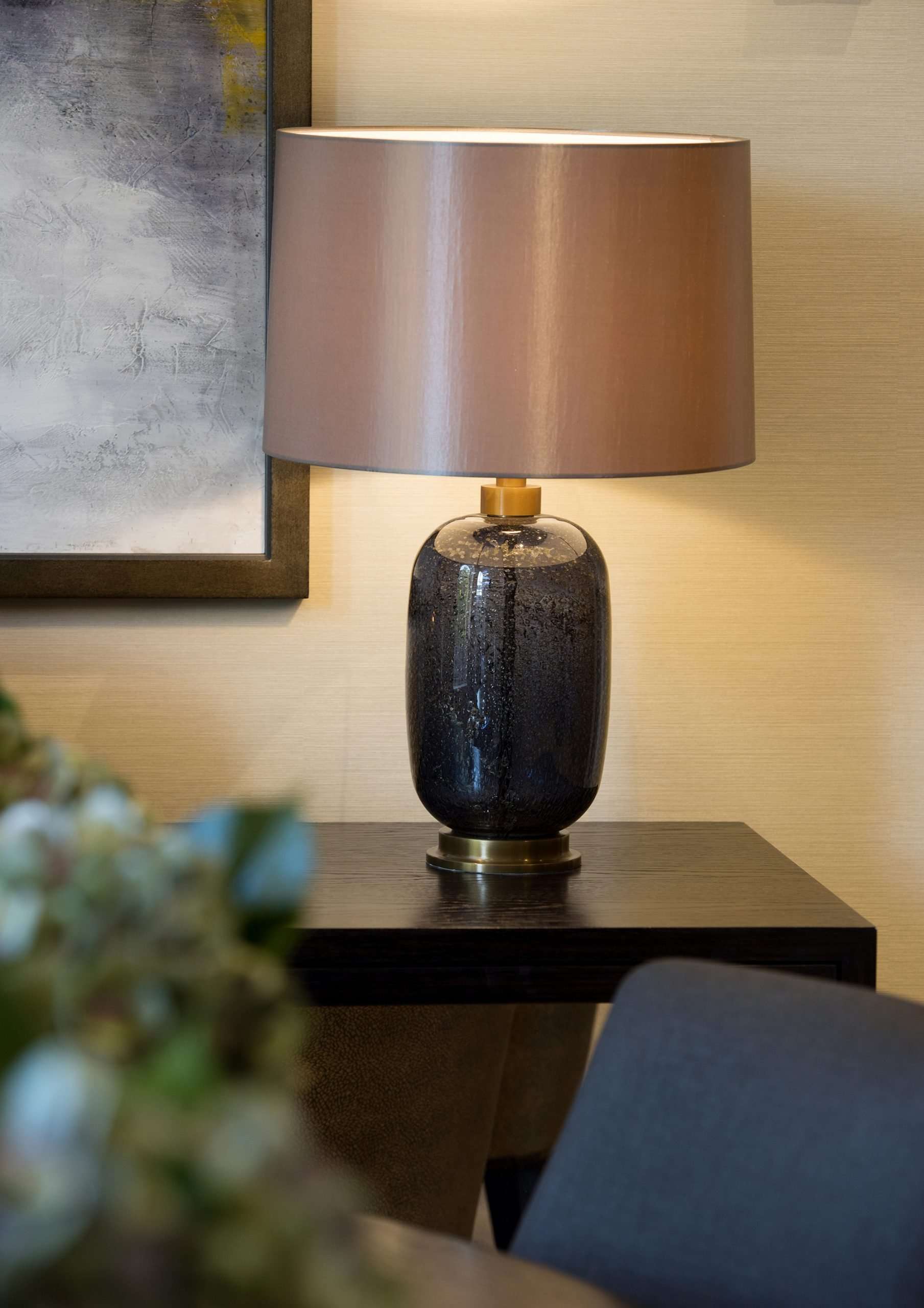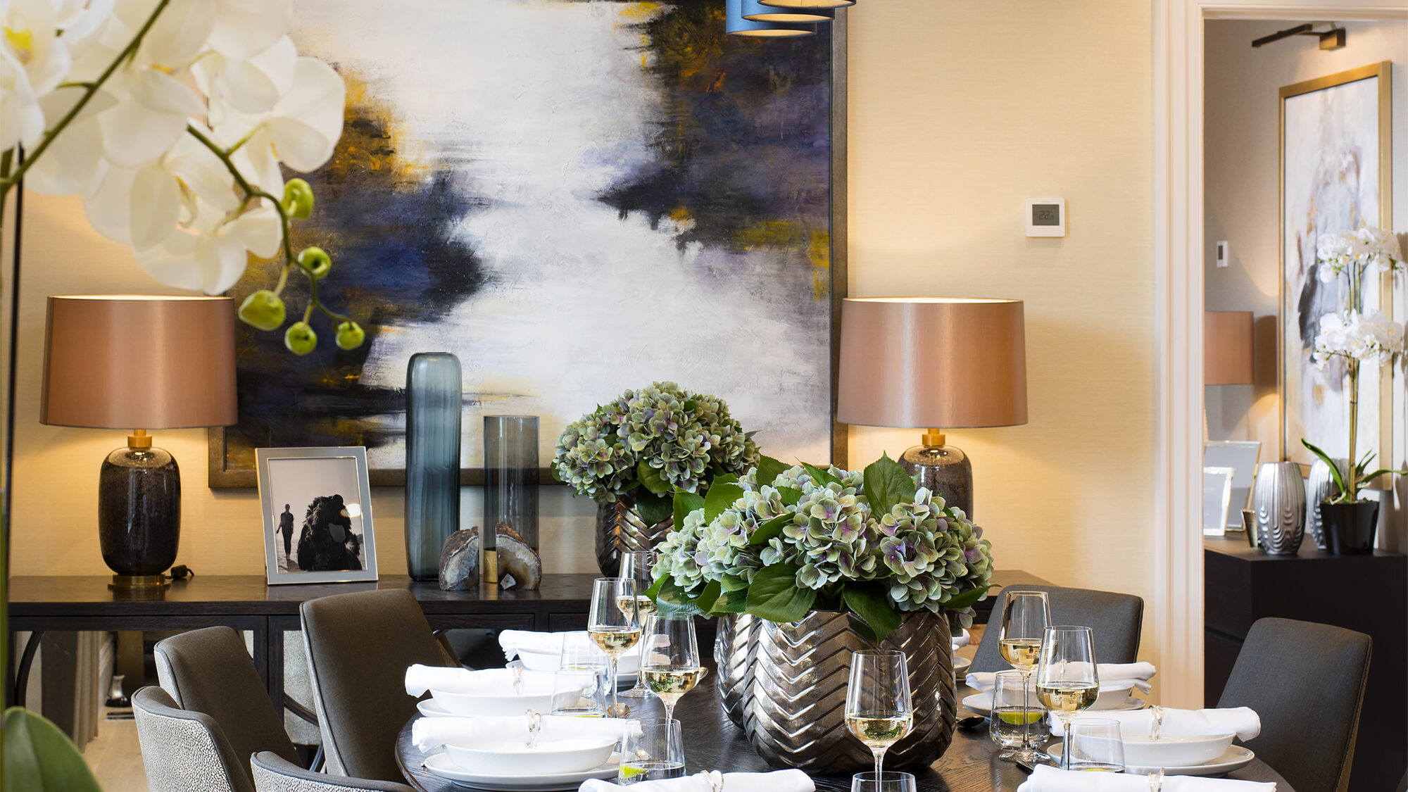 We dressed this space with accessories in rich bronze tones to add warmth and character to the room. The vases which adorn the dining table are crafted from bronze ceramic and finished with a glaze whilst artfully styled with artificial hydrangeas. Other key pieces in this space are the matching lamp set placed elegantly on a sideboard which features a hand-blown glass base with a bubble effect in a warm tones of bronze.