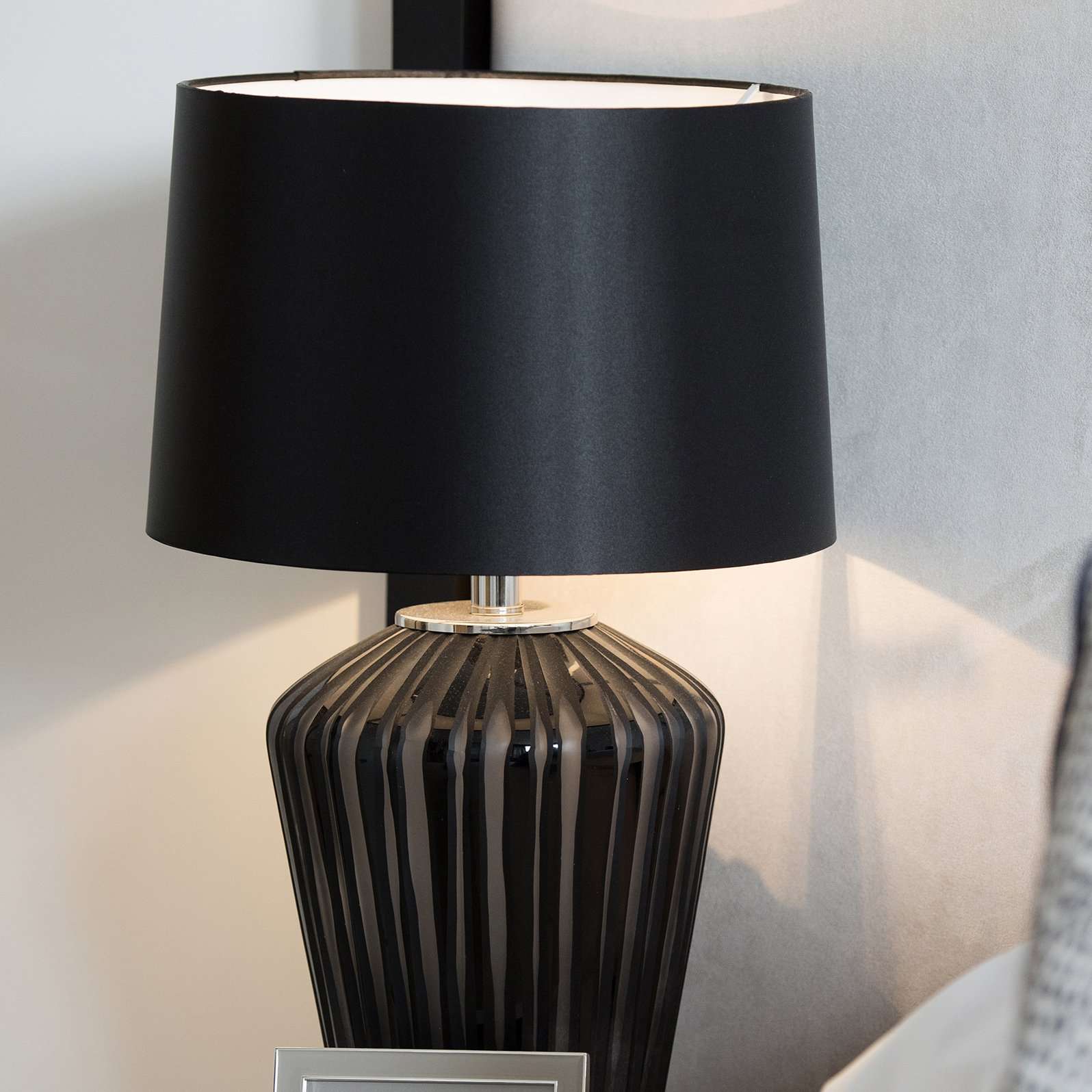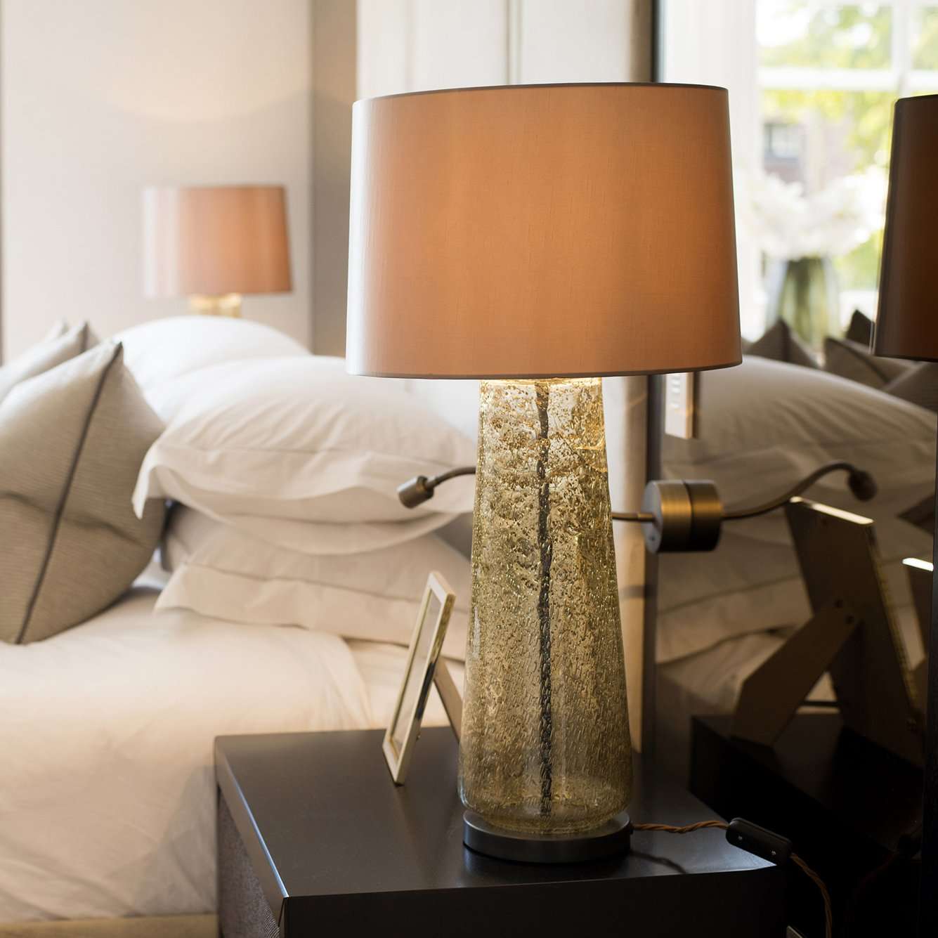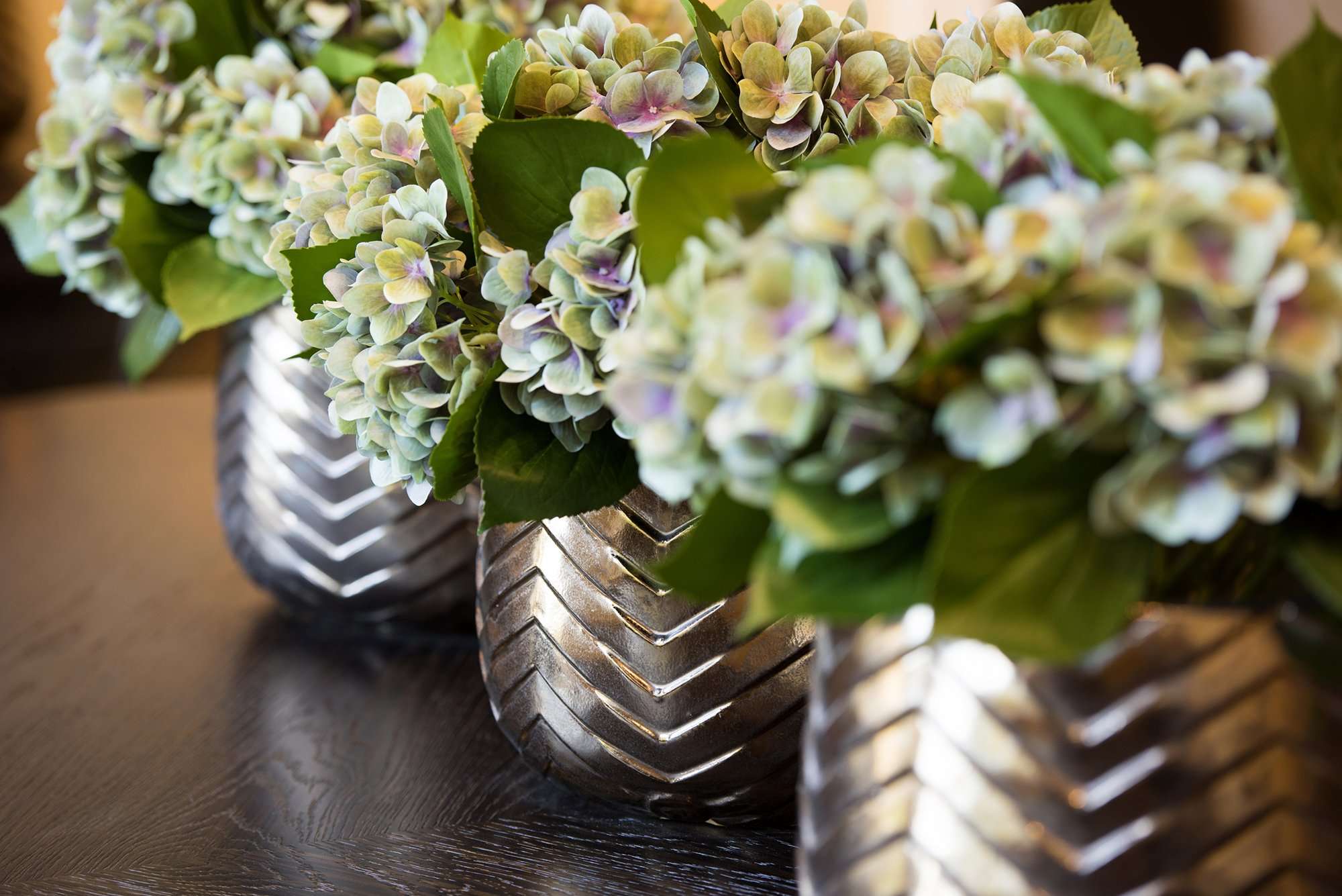 We dressed this space with accessories in rich bronze tones to add warmth and character to the room. The vases which adorn the dining table are crafted from bronze ceramic and finished with a glaze whilst artfully styled with artificial hydrangeas. Other key pieces in this space are the matching lamp set placed elegantly on a sideboard which features a hand-blown glass base with a bubble effect in a warm tones of bronze.