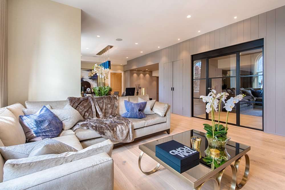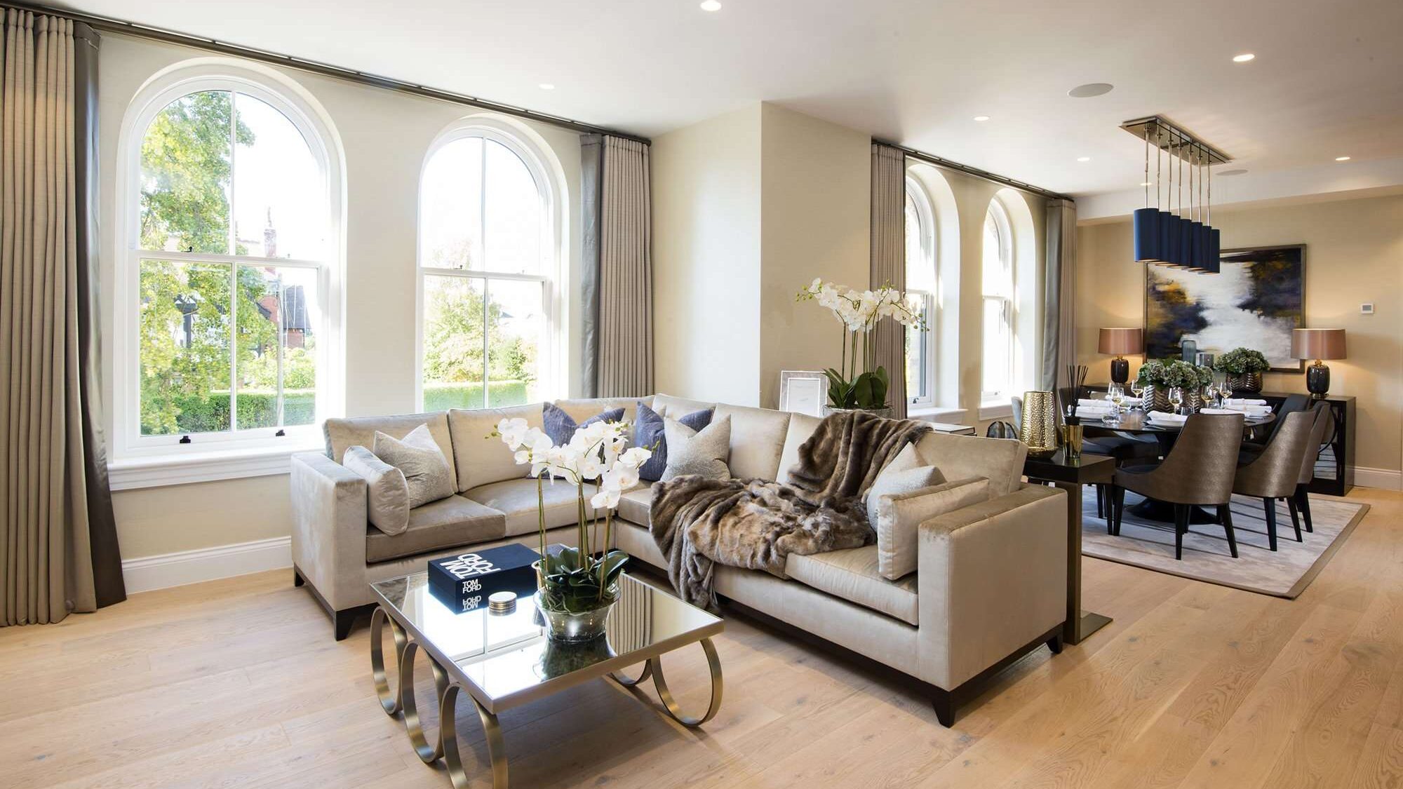 An L-shaped sofa in cream velvet speaks of understated sophistication without compromising on comfort, whilst the period windows are framed in floor-to-ceiling curtains crafted from muted tones of ecru with the leading edge in a darker, contrasting colour.