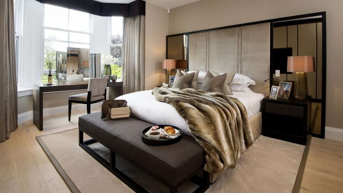 The elegant scheme used in the master bedroom flows effortlessly down into the dressing room which is positioned on a slightly lower level to add interest and create definition to the space. The bespoke cabinetry features doors in faux suede with hammered bronze handles. The statement piece in the room is a shoe display with inset LED lighting to each shelf. The adjacent wall is designed with a mirrored panel which hides a secret door – a discreet fire exit from the study beyond.
