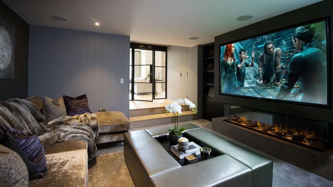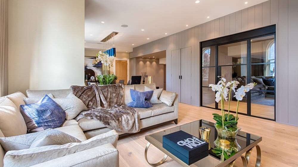 The 85-inch television screen is mounted onto the face of a spectacular three-sided floating chimney. The fire springs to life at the touch of a button and bathes the space in a warm glow.