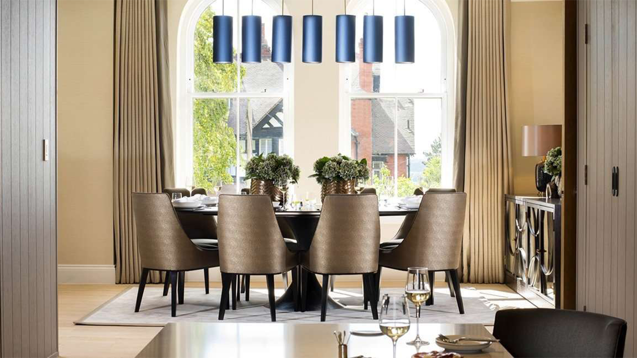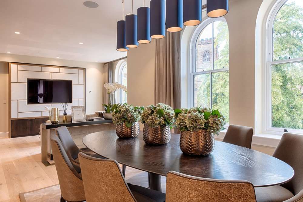 An ebonised oak and dark bronze oval table form the focal point whilst drop pendant lights adorned with blue silk shades, together with gold lining, create a warm ambiance which lends itself to entertaining.