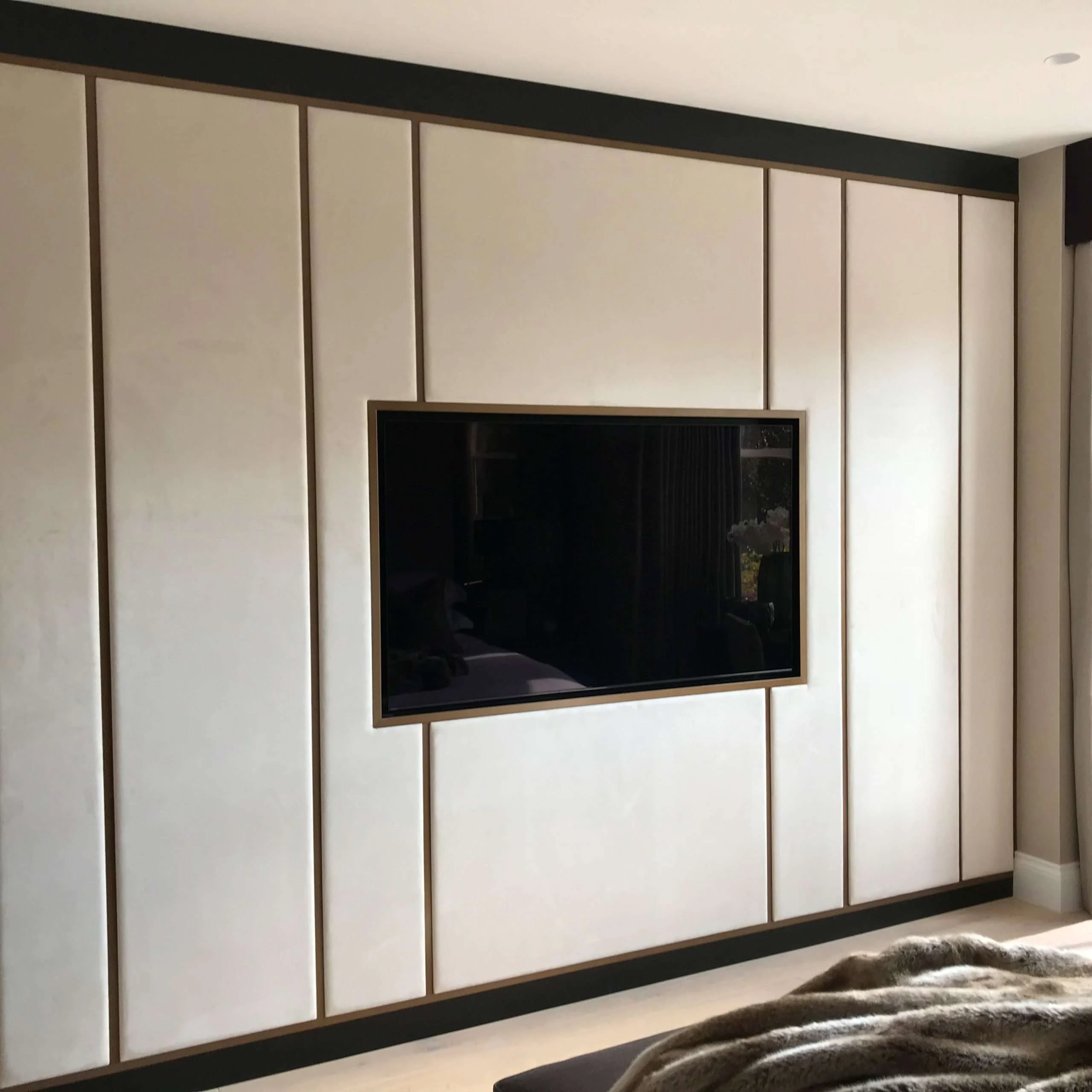We designed bespoke soundproof cabinetry with faux suede panelling and a bronze trim to conceal them from sight whilst allowing for access when required.